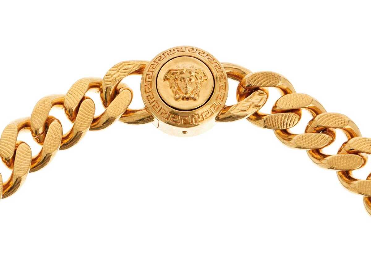 Versace Tribute Gold-finished metal chain necklace, enriched by guilloché engraving on the chain and a snap closure with the iconic Medusa and Greek Key embellishments, logo engraved on the back. Lead and nickel free. One size fits all.