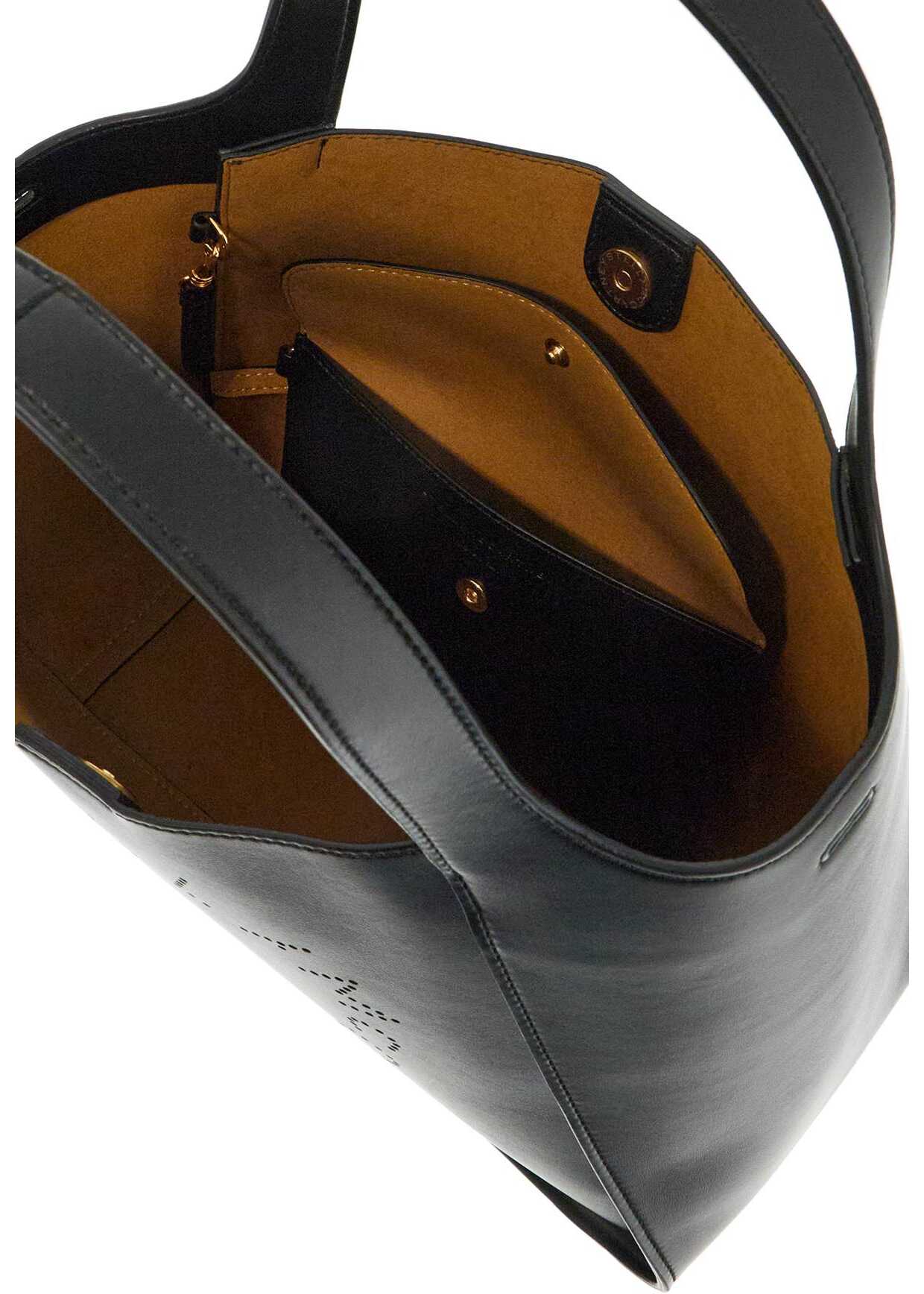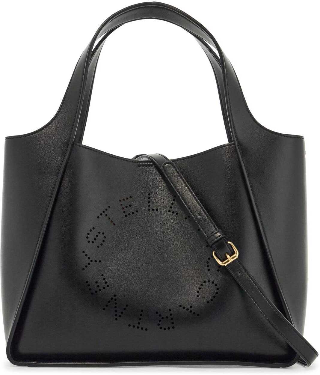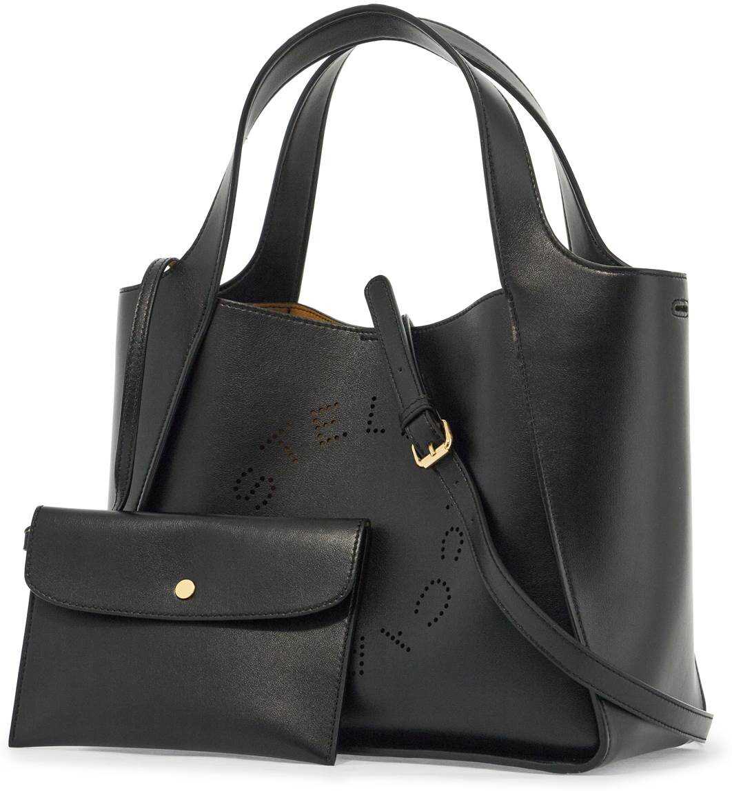 Stella McCartney tote bag crafted in faux leather with openworked Stella logo on front. Double top handle and adjustable and removable shoulder strap. Magnetic button closure, suede-effect interior featuring a detachable pouch with flap and press-stud. Gold-finished metalware.