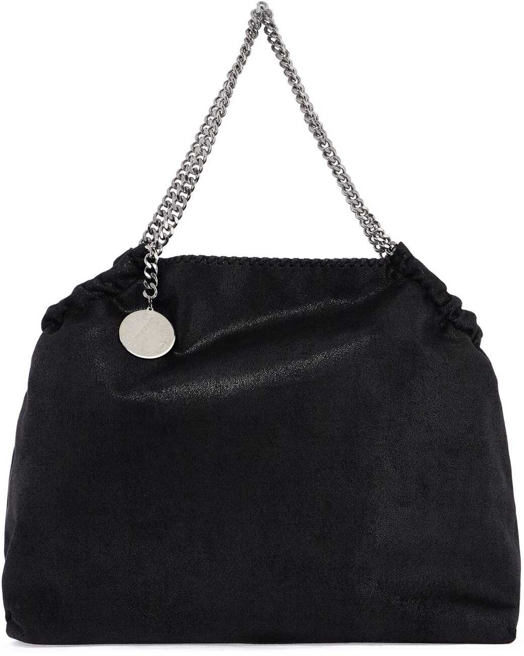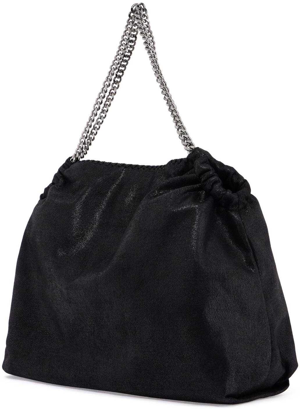 This Stella McCartney tote bag, a reinterpretation of the iconic Falabella, is made from matte Shaggy Deer vegan fabric with a semi-glossy grain. It features the emblematic diamond-effect chain in recycled brass and aluminum, which serves as a double handle. The deconstructed and spacious design is finished with waxed cotton laces embroidered on the top edge and an engraved medallion charm. Magnetic closure, lined interior in recycled logo fabric with a zip pocket. Metallic accessories with silver