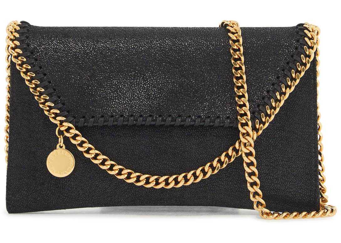 Stella McCartney crossbody bag crafted in shaggy deer faux leather with metal chain flap edge and shoulder strap. Magnetic button closure, branded fabric lining and one inner open flat pocket. Gold-finished metalware and iconic medal with engraved logo.