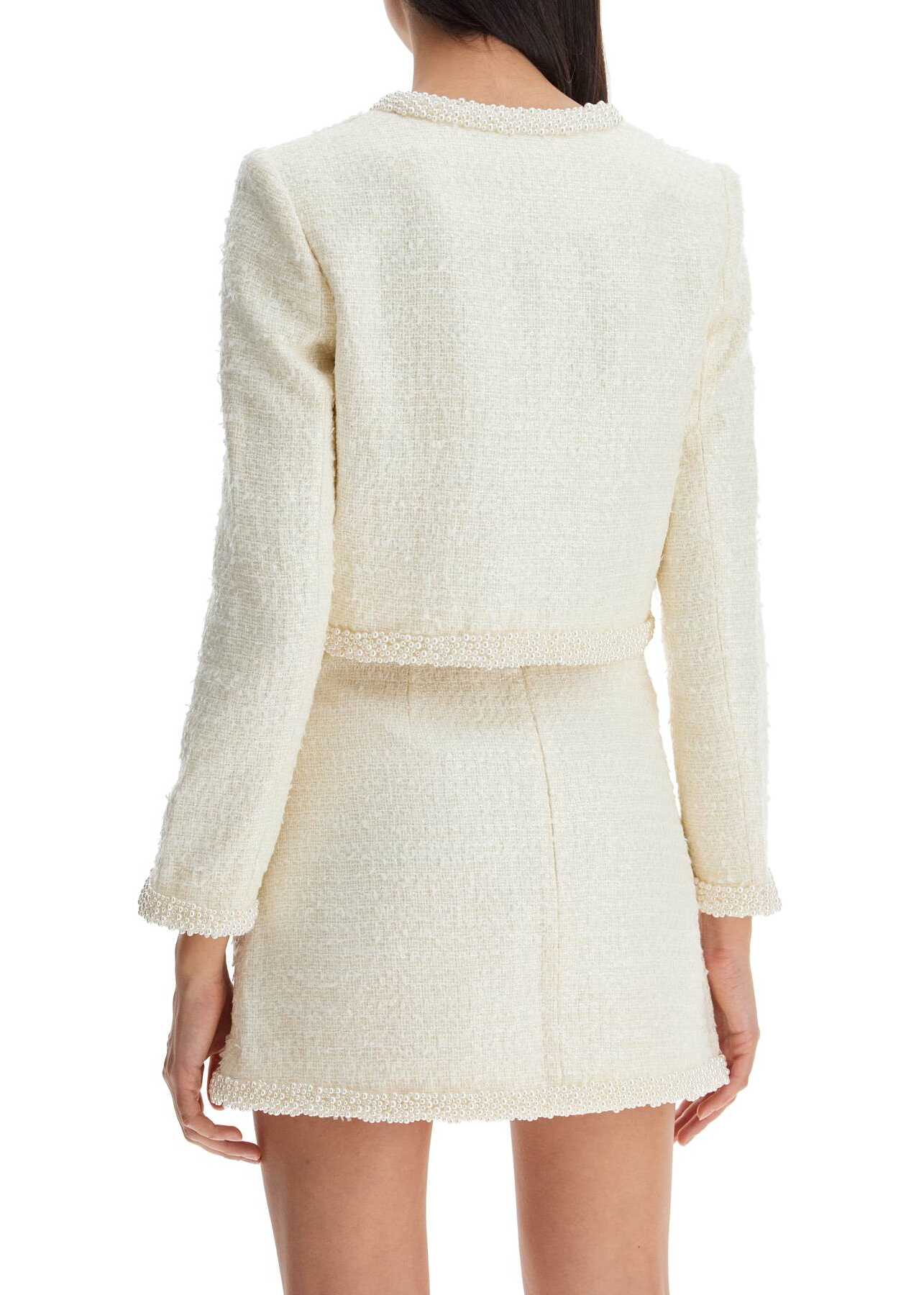 This Self-Portrait round-neck jacket is made of soft structured bouclé fabric, embellished with small translucent sequins all over and a pearl decoration on the edges. It features a short and square silhouette with two front pockets and hidden snap buttons closure. Fully lined interior. The model is 177 cm tall and wears a UK size 6.