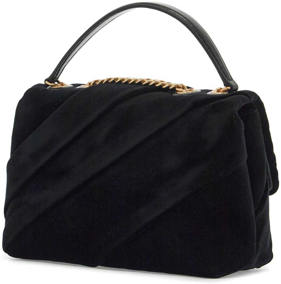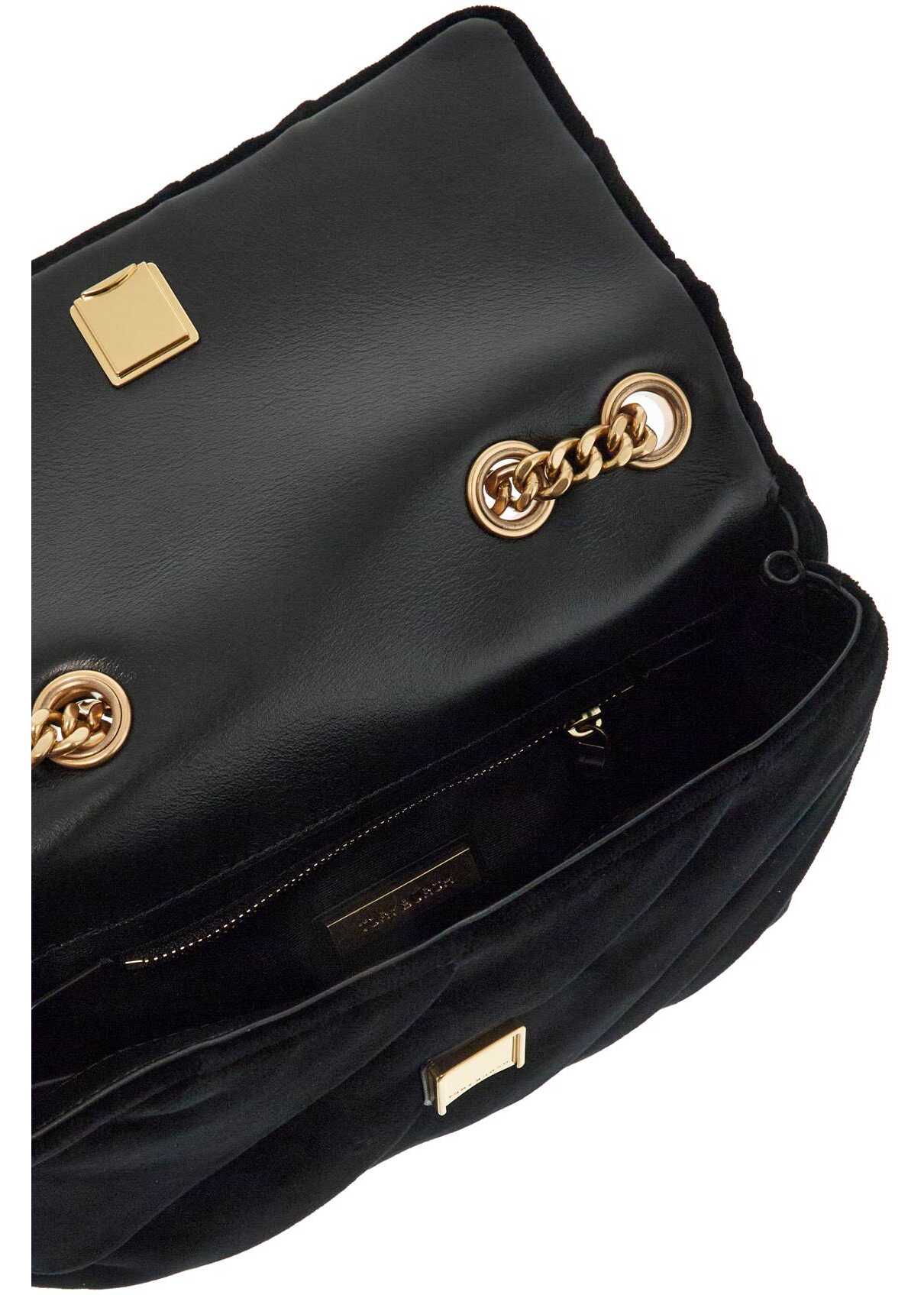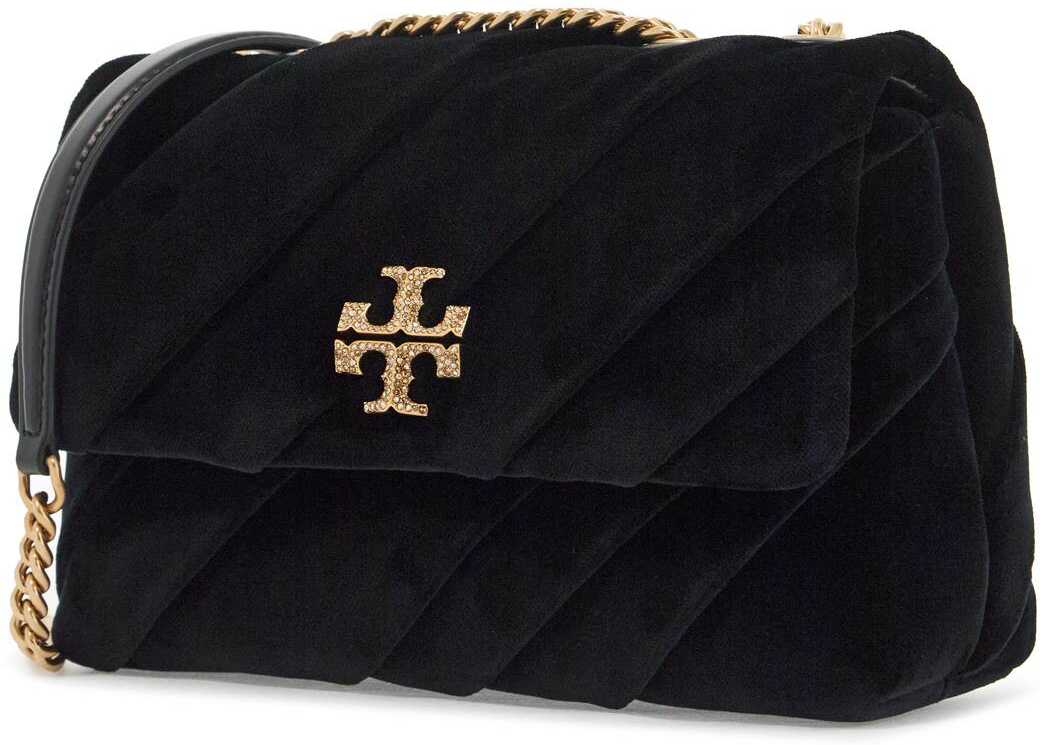 The small Kira shoulder bag by Tory Burch is made of delicately folded and draped cotton velvet. The flap has a magnetic closure enriched with the iconic double T in metal with crystal pavé, while the sliding chain strap features a leather insert for wearing it as a double or long strap. The interior is lined with grosgrain fabric and has one open pocket and one zippered pocket. The metallic accessories have a gold finish.