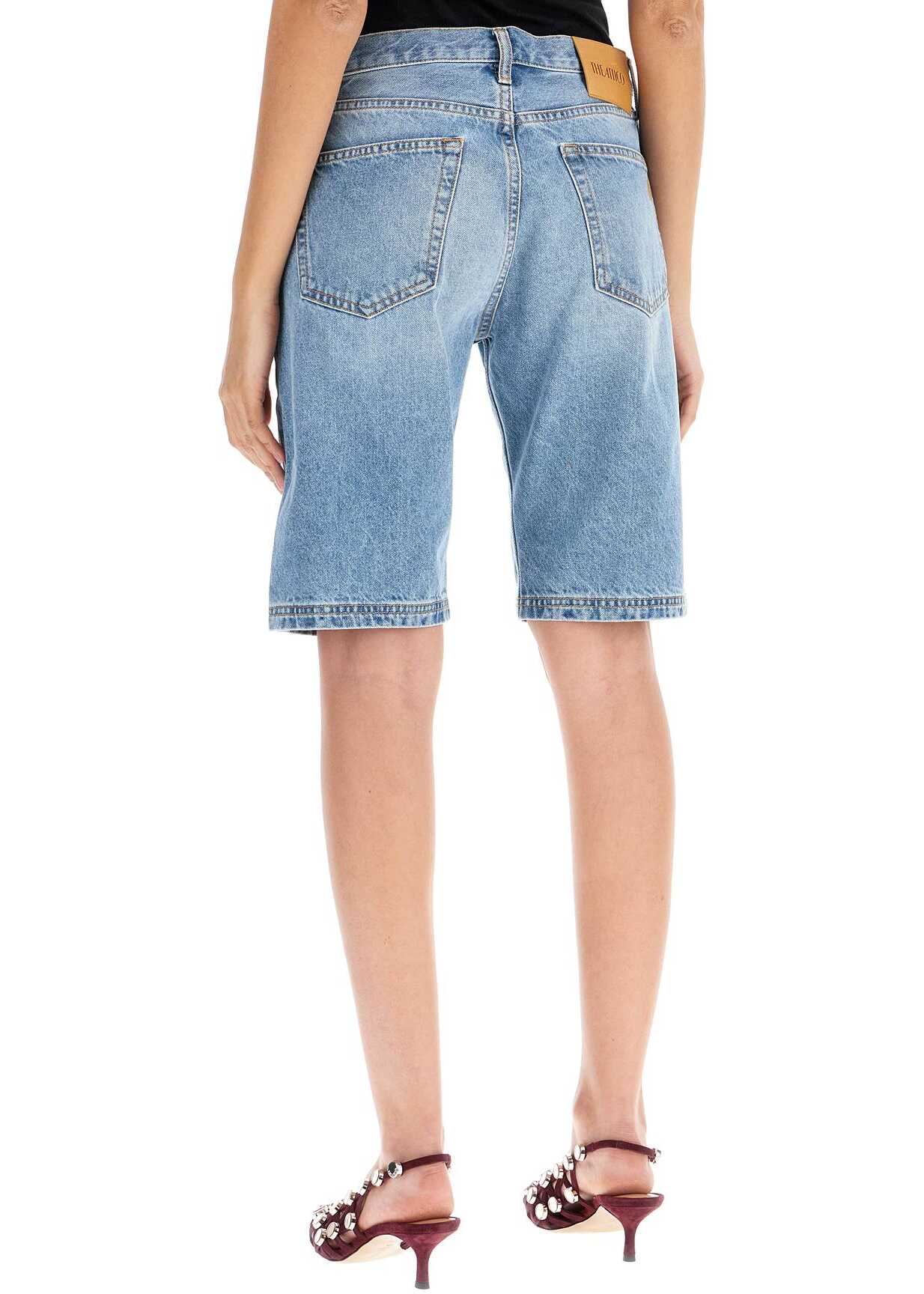 The Attico Bermuda shorts are made of pure cotton denim with a basic blue sky wash, featuring a boyfriend fit and finished with a fifth pleated pocket. They have a hidden button closure, a back jacron patch, and a contrasting embroidered monogram on the back. The model is 177 cm tall and wears size 26.