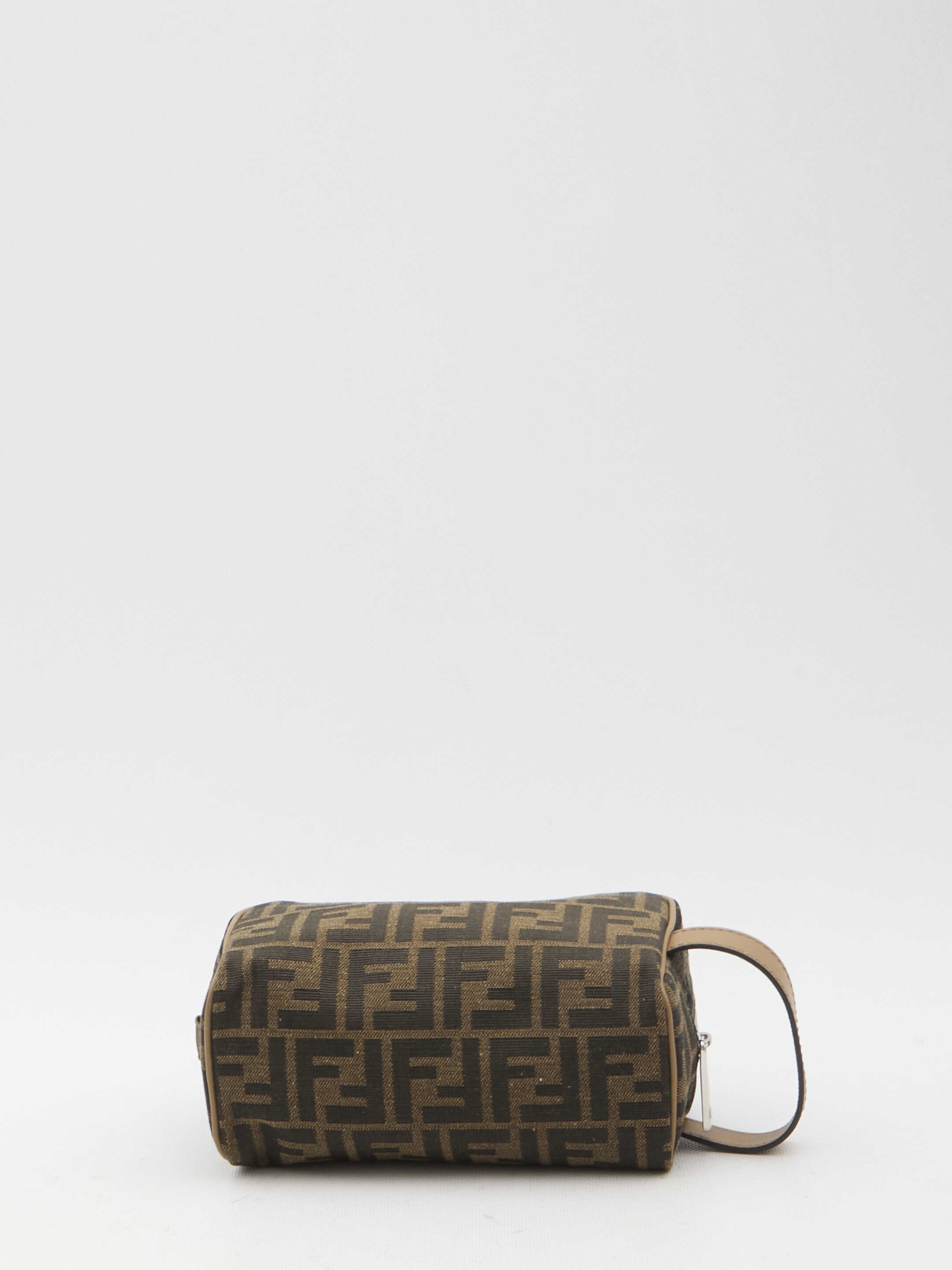 Small toiletry case with zip closure. Made of brown FF jacquard, complemented by a beige leather handle. Features a washable fabric-lined interior and palladium-finish metal details. Dust bag included. Any leather imperfections are not to be considered manufacturing defects, but a peculiarity of the material.