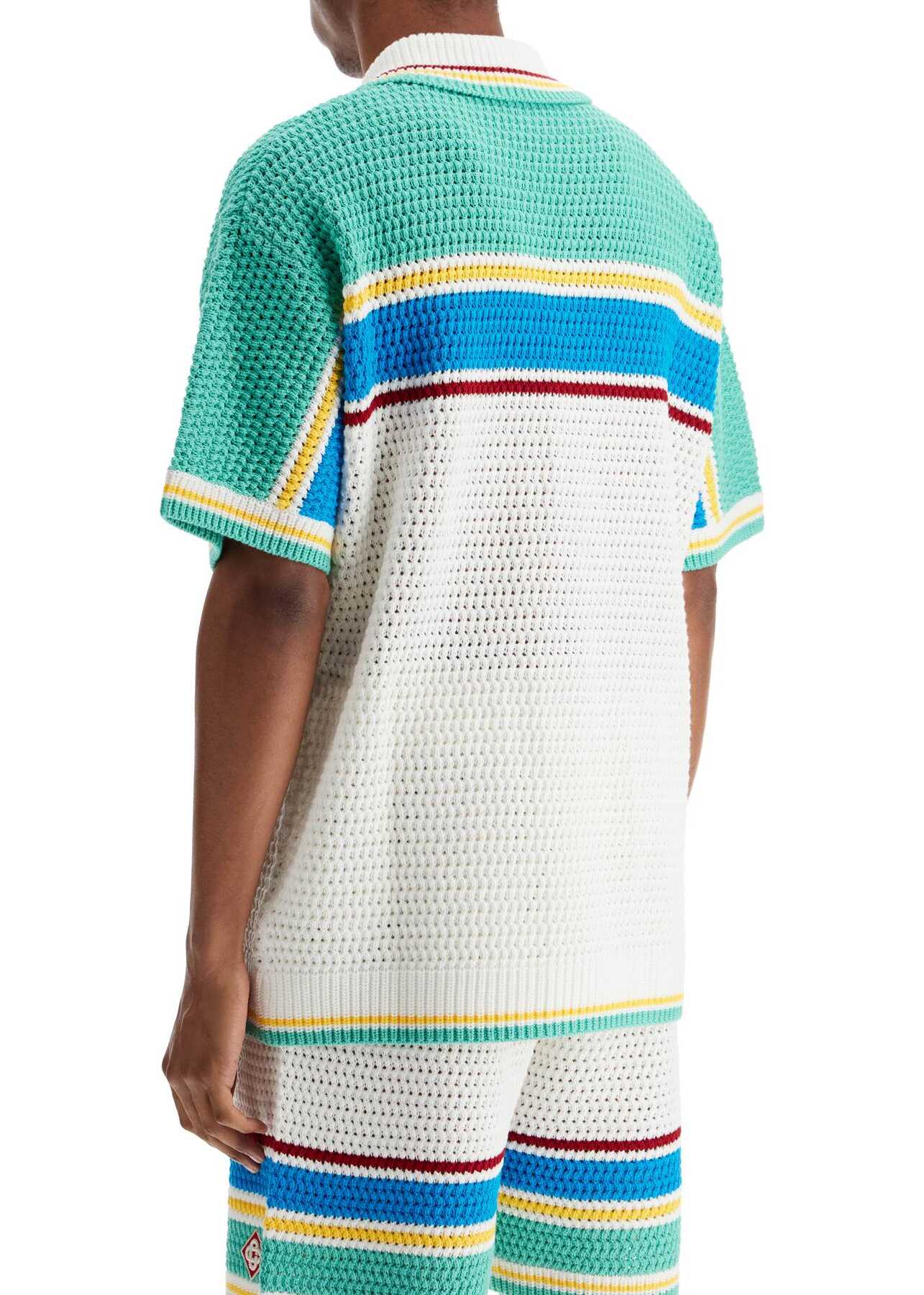 Crafted in crochet-effect knit, this Casablanca shirt is embellished with a multicolored striped pattern and jewel buttons. It features an oversized fit with a bowling collar, two applied pockets at the bottom, and ribbed finishes on the edges. Embroidered logo patch on the chest. The model is 182 cm tall and wears size M.