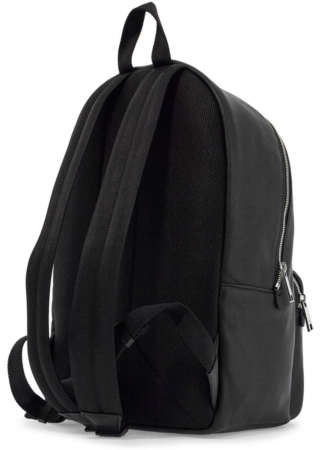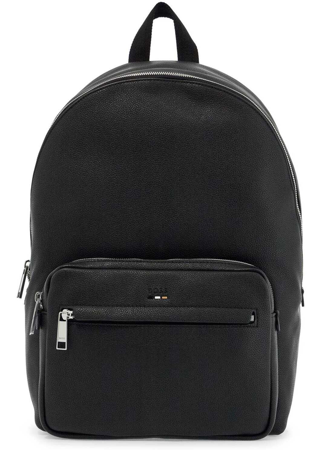 The BOSS backpack is made of burgundy eco-leather with an embossed lettering logo on the front pocket. The main compartment has a two-way zip closure, and the interior is lined with one zippered pocket and two open pockets. The back is padded with mesh and the shoulder straps are adjustable. The metal hardware has a silver finish.