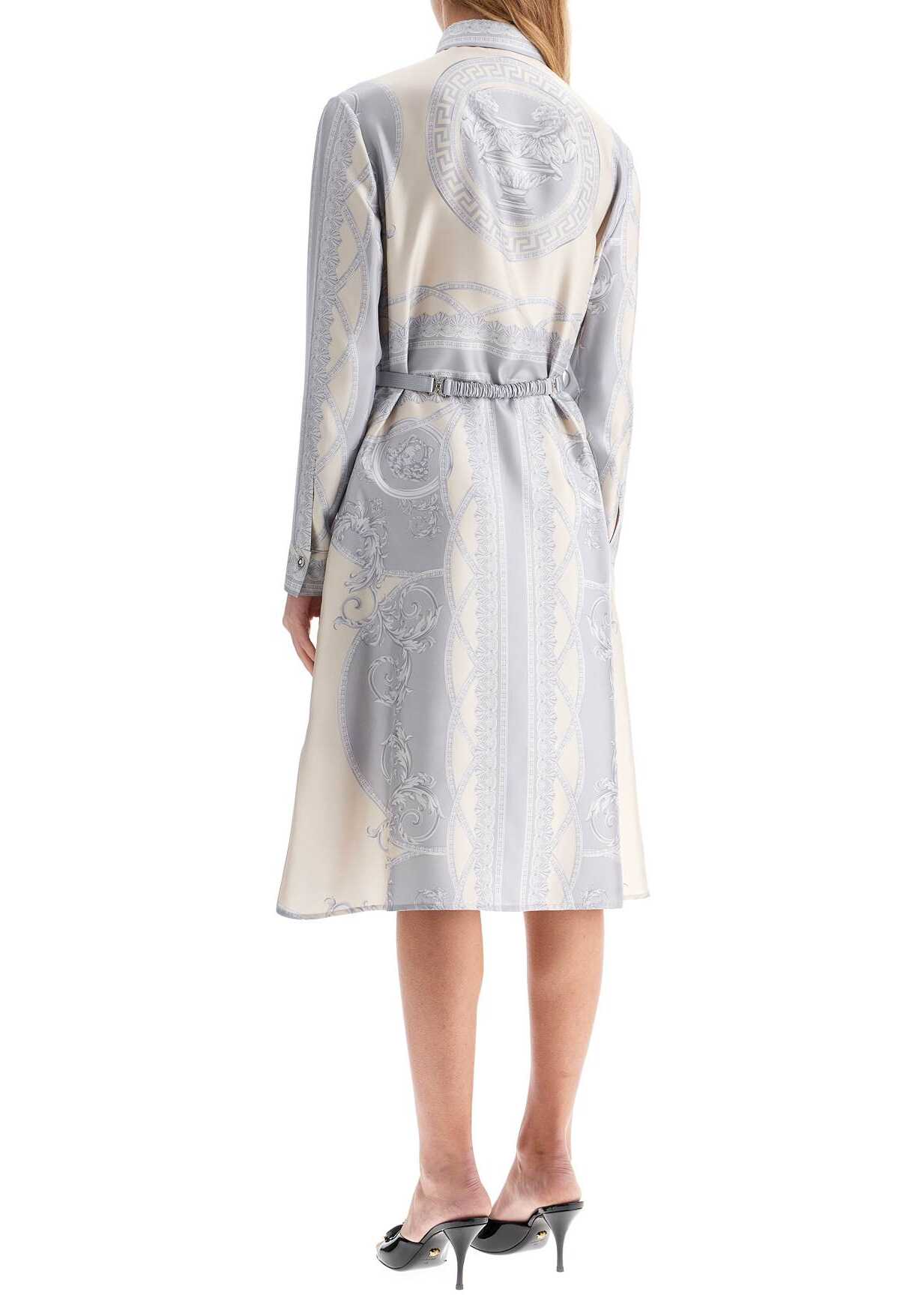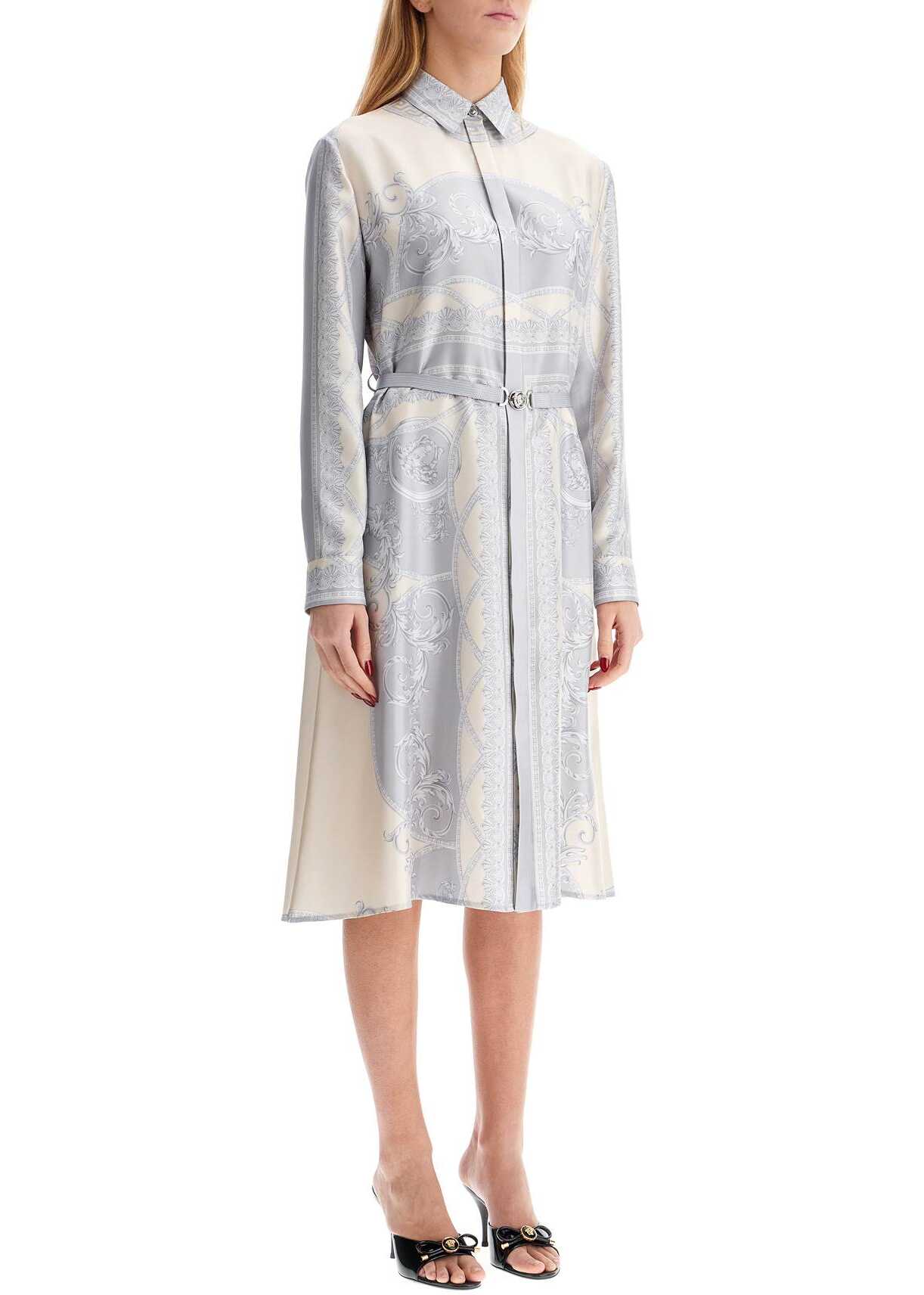 This Versace chemisier dress features a straight silhouette and knee-length design, made from pure silk twill with an all-over 'La Coupe des Dieux' print. The long-sleeved style is completed with Medusa button cuffs, a classic pointed collar, and a full hidden button placket. The waist is defined by a semi-elasticized belt with a silver-finished Medusa buckle. The model is 177 cm tall and wears size IT 40.