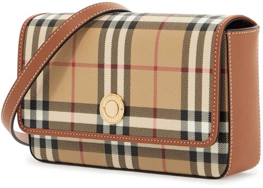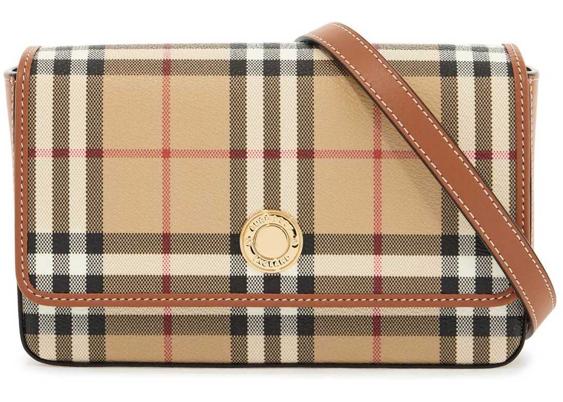 This shoulder bag is made of coated canvas with the iconic Burberry Check pattern, enriched with smooth leather details and an engraved front button. It features a magnetic flap closure, a cotton twill interior with a leather open pocket, and an adjustable and removable shoulder strap. The metal accessories have a shiny gold finish.