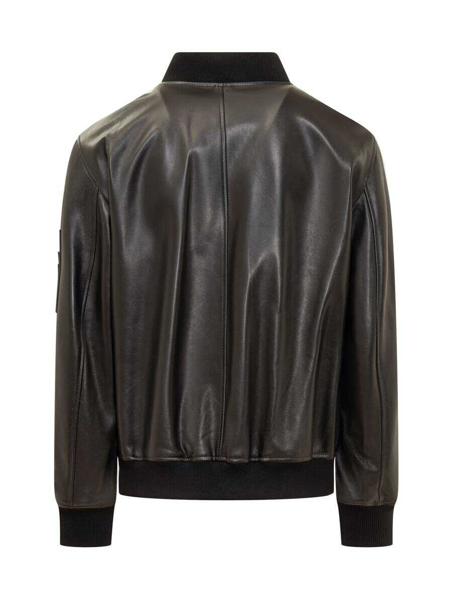 Black leather jacket. Zipper closure. Zippered pockets. Zipper pocket on sleeve. Stretch knit collar, hem and cuffs. Embroidered logo on front. Lined interior with Barocco print. Two inside pockets.