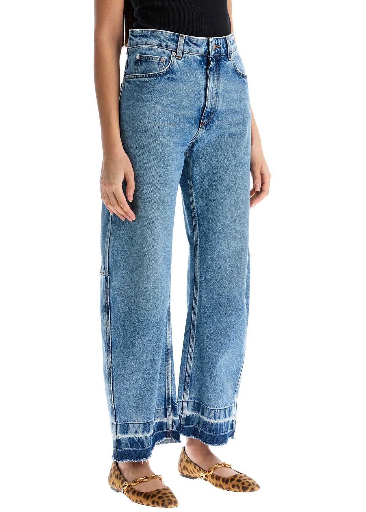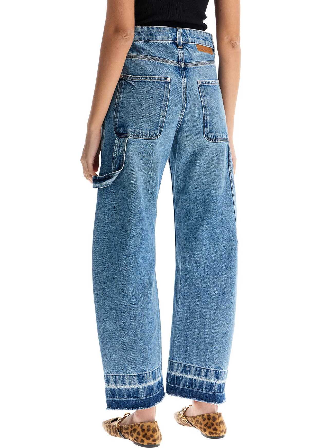 These Stella McCartney five-pocket jeans have a barrel silhouette and are made from organic cotton denim with a distressed wash and frayed hems. They feature a side hammer loop and a vegan leather back patch. The model is 177 cm tall and wears size 26.