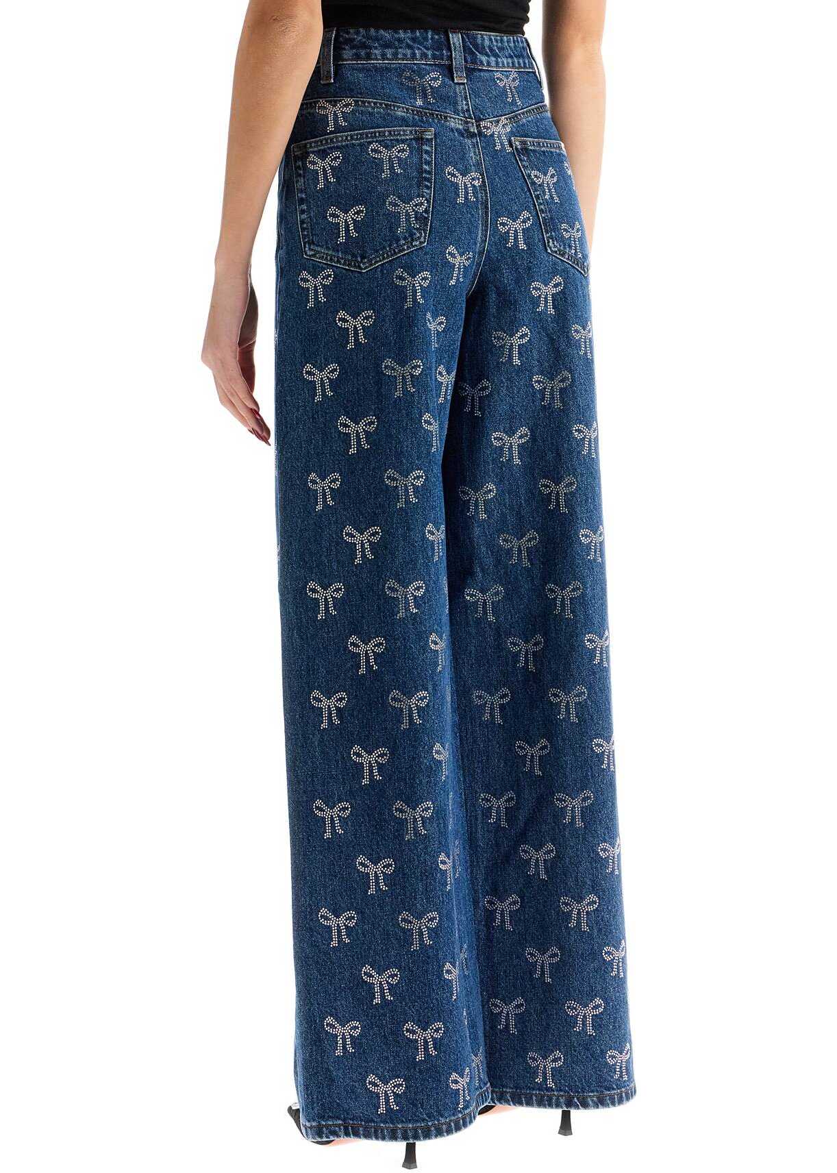 Self-Portrait jeans made of cotton denim and decorated with all-over rhinestone bows. They feature a medium waist, hidden zip closure and buttons, and a wide fit with straight leg. The model is 177 cm tall and wears size 26.