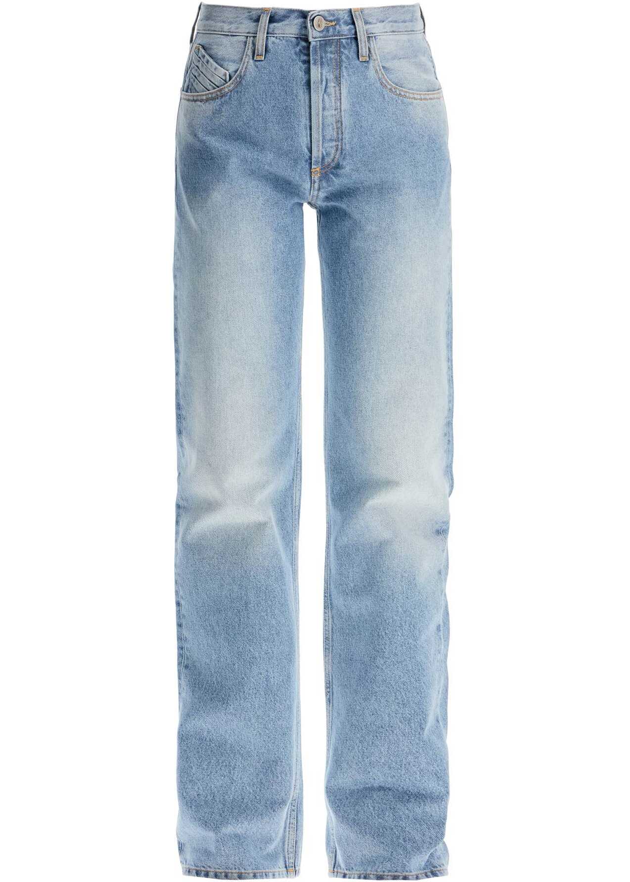 The Attico boyfriend jeans feature a straight leg and medium rise, made from firm denim with a glossy Sky Blue coating. They have a classic five-pocket construction with contrasting stitching, belt loops, and button closure. The iconic pleated detail on the fifth pocket adds a unique touch. The model is 177 cm tall and wears a size 26.