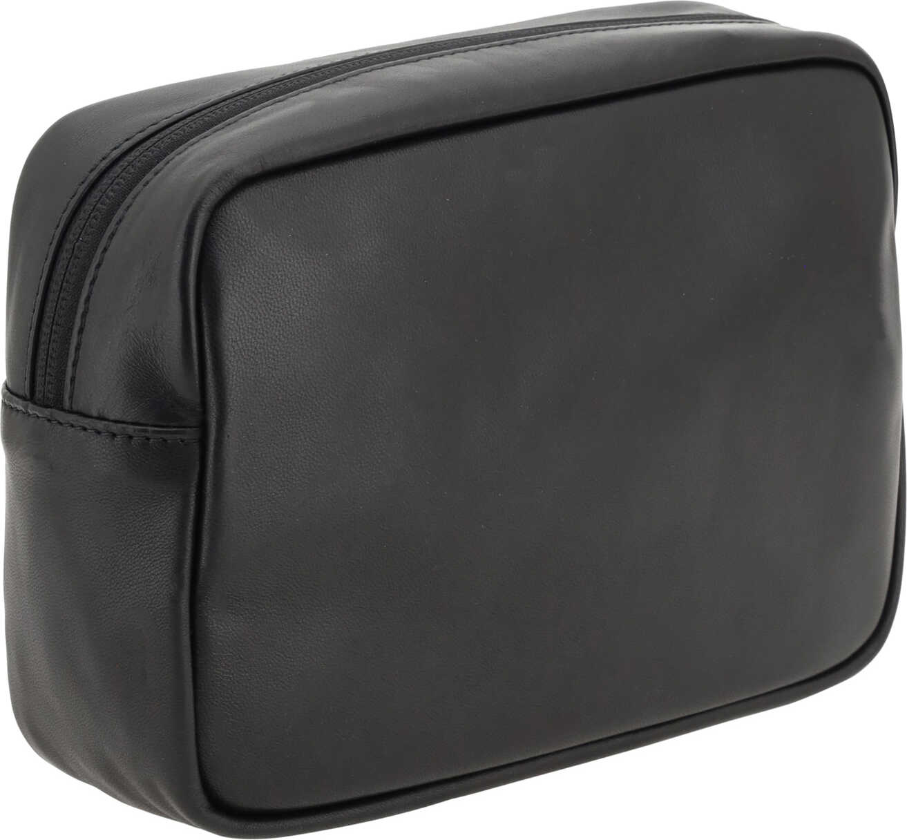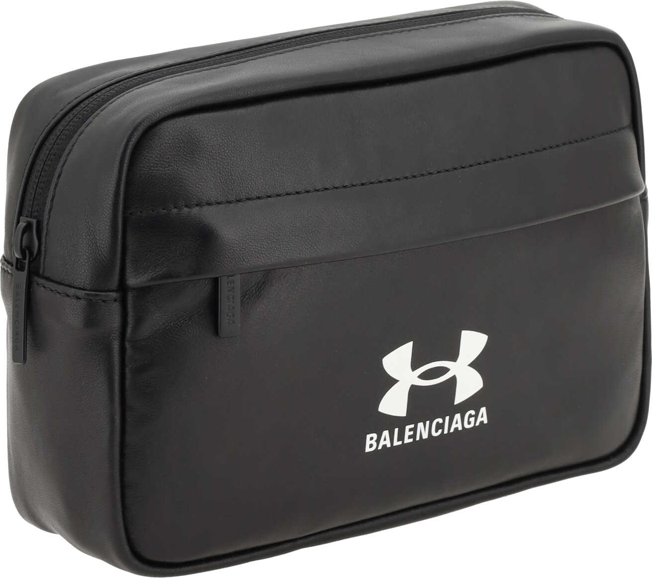 Leather Beauty Case by Balenciaga, lap zipper closure at top, zippered welt pocket on front, iconic contrasting monogram on front, single interior compartment.