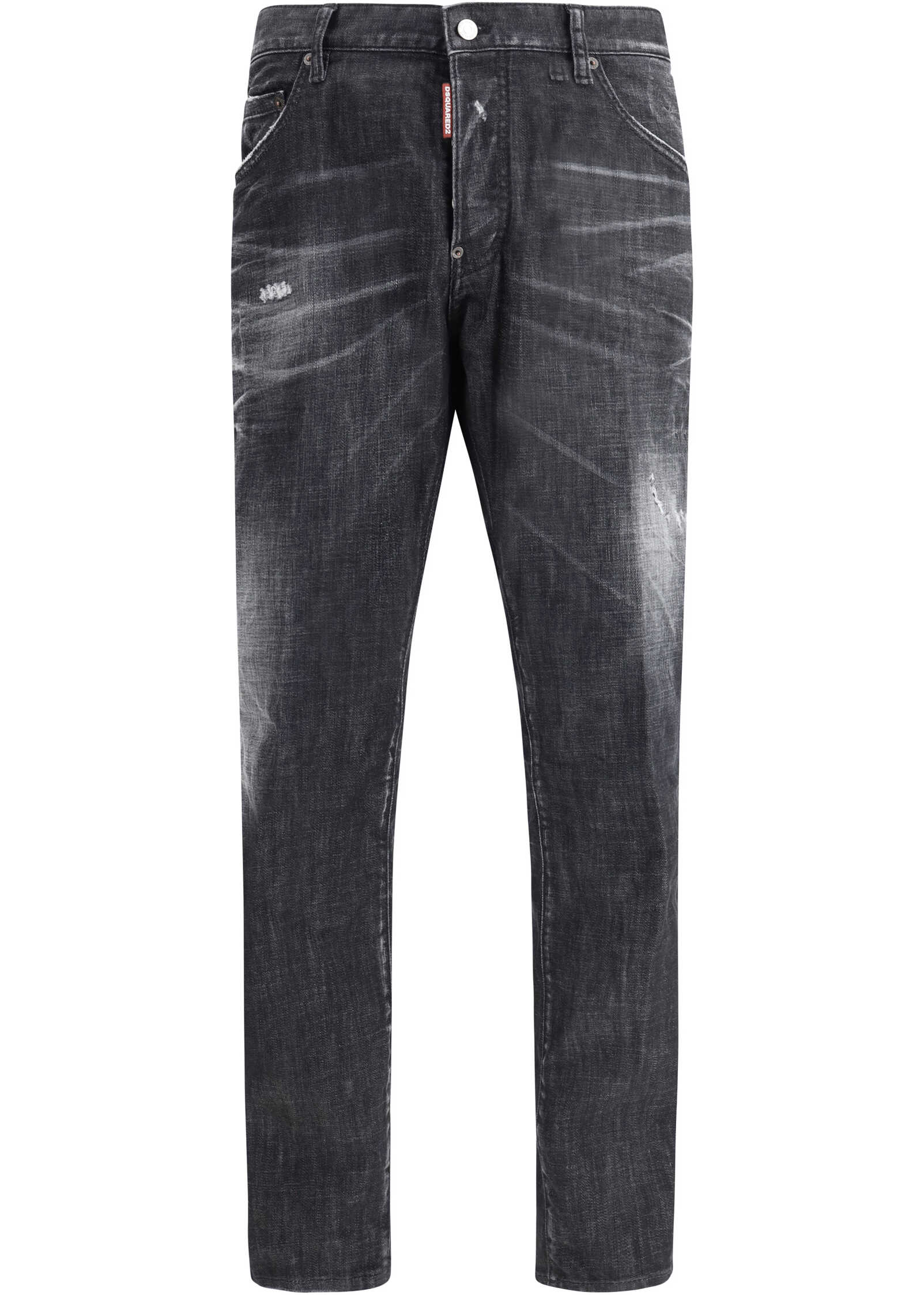 Cotton Skater Jeans by Dsquared2 featuring a mid-rise, a vintage worn-effect design, a five-pocket straight style, a front button fastening, waistband loops, and an iconic branded leather signature pressure-printed patch applied to the back.