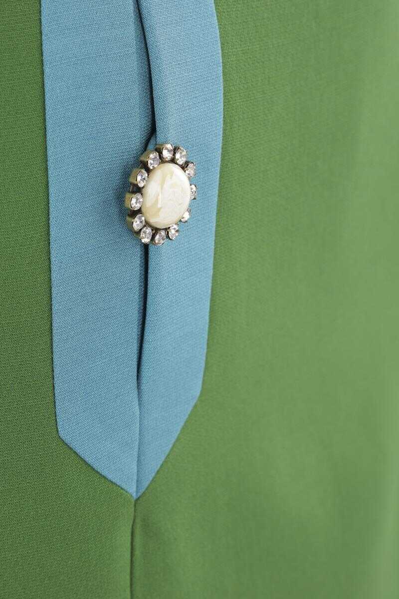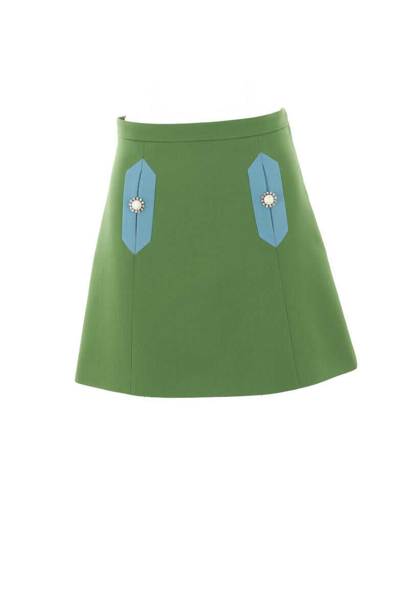 Valentino Garavani A-line mini skirt crafted from green Crepe Couture. Featuring a side closure with a hook and invisible zip, contrasting front pockets adorned with jeweled buttons and a jacquard lining.