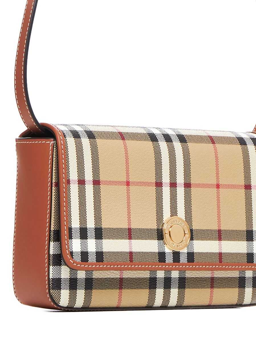Burberry’s Hampshire bag in iconic check motif coated cotton blend canvas in beige tones and tan leather featuring an adjustable and detachable shoulder strap, concealed magnetic fastening, internal slip pocket and gold-tone metal hardware.