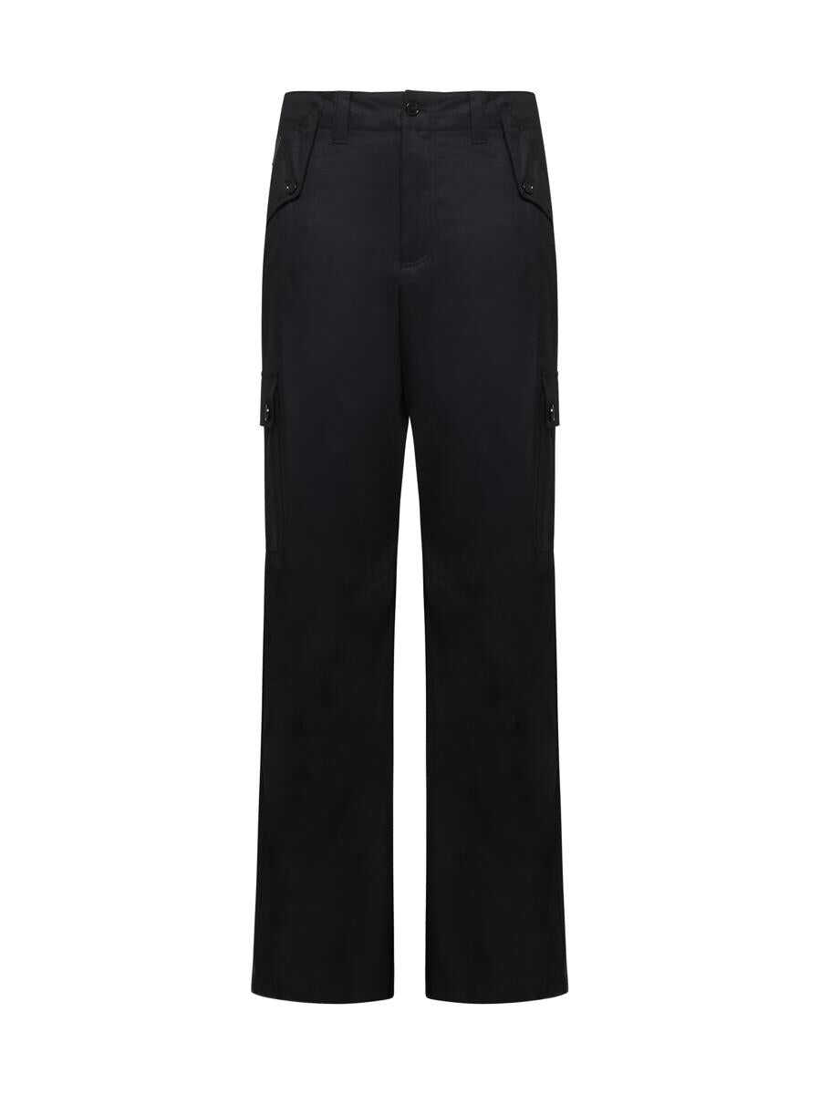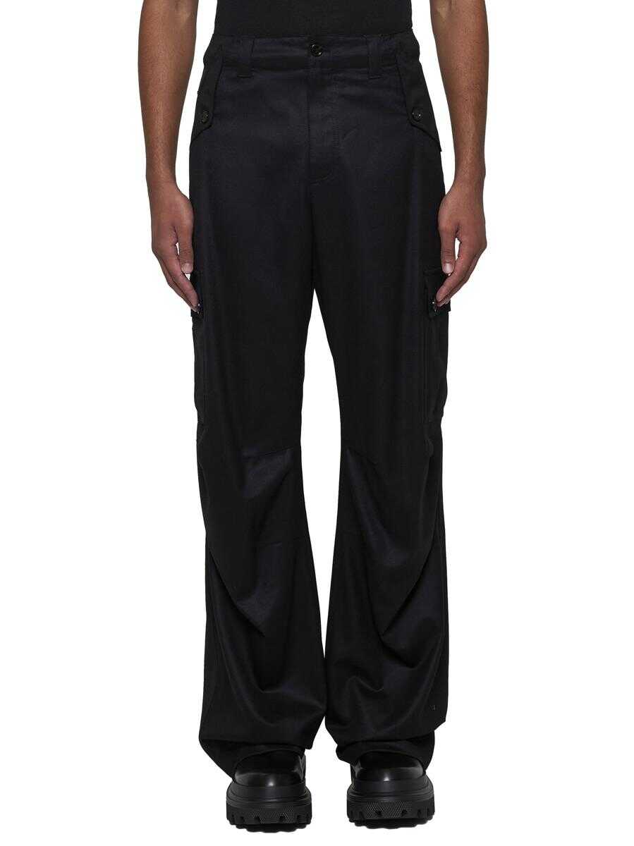 Dolce & Gabbana’s black virgin wool cargo trousers featuring belt loops, button and zip fly, side and back pockets with flaps and buttons, logo label on the right hip and flared leg.
