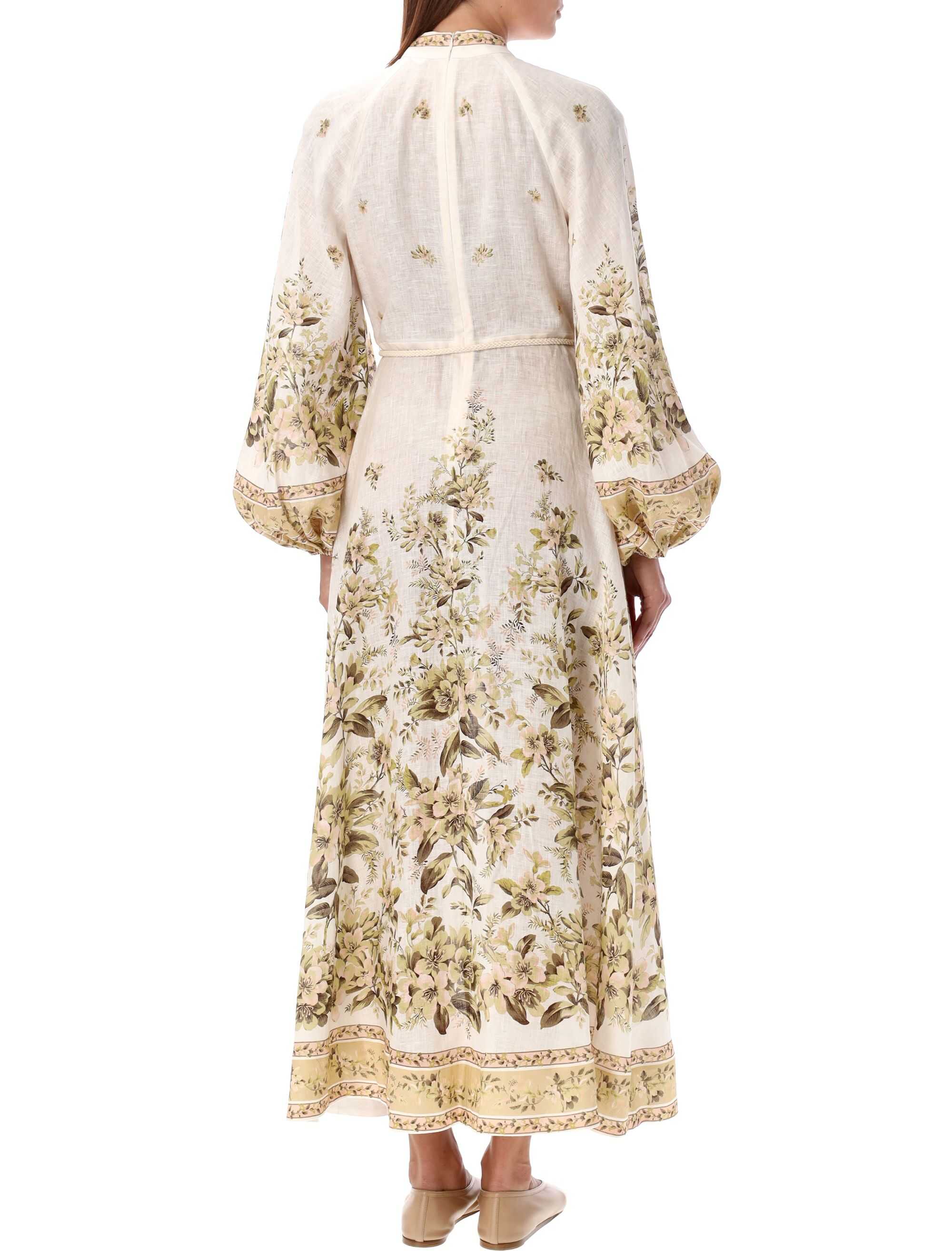 Elevate your style with this exquisite Sage Flower Long Dress by Zimmermann. Crafted from 100% linen, this dress features a relaxed fit, high collar, long lantern sleeves, front button closure, and intricate floral embroidery. Complete the look with the belted waist. Model is 1.72m and wears size 1. Perfect for any occasion!