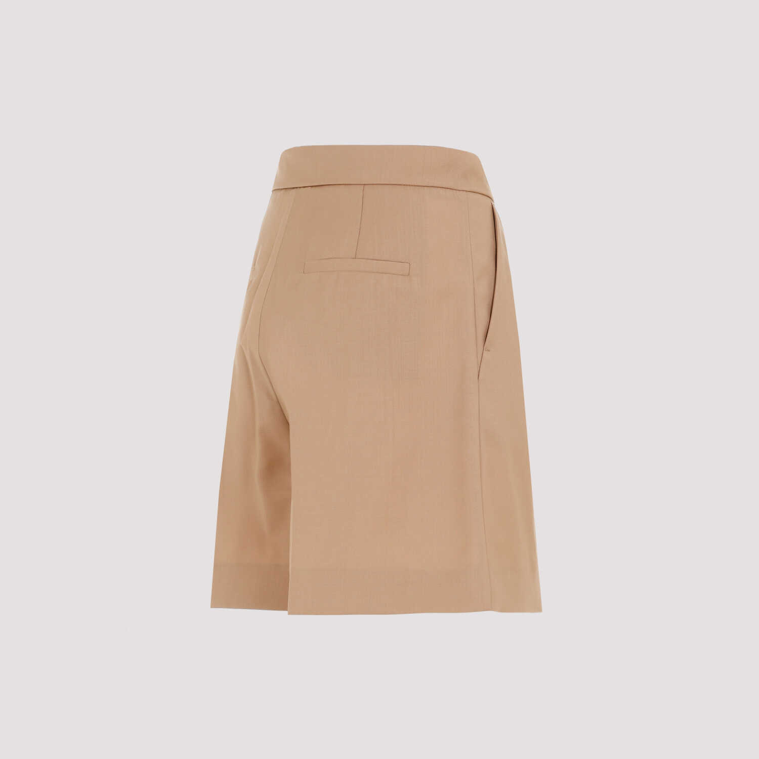 Max Mara Camel Brown Virgin Wool Jessica Shorts. Pure camel brown virgin wool shorts, front concealing zipped and hook fastening, front pleated details, side pockets, back slit pockets, straight hem.