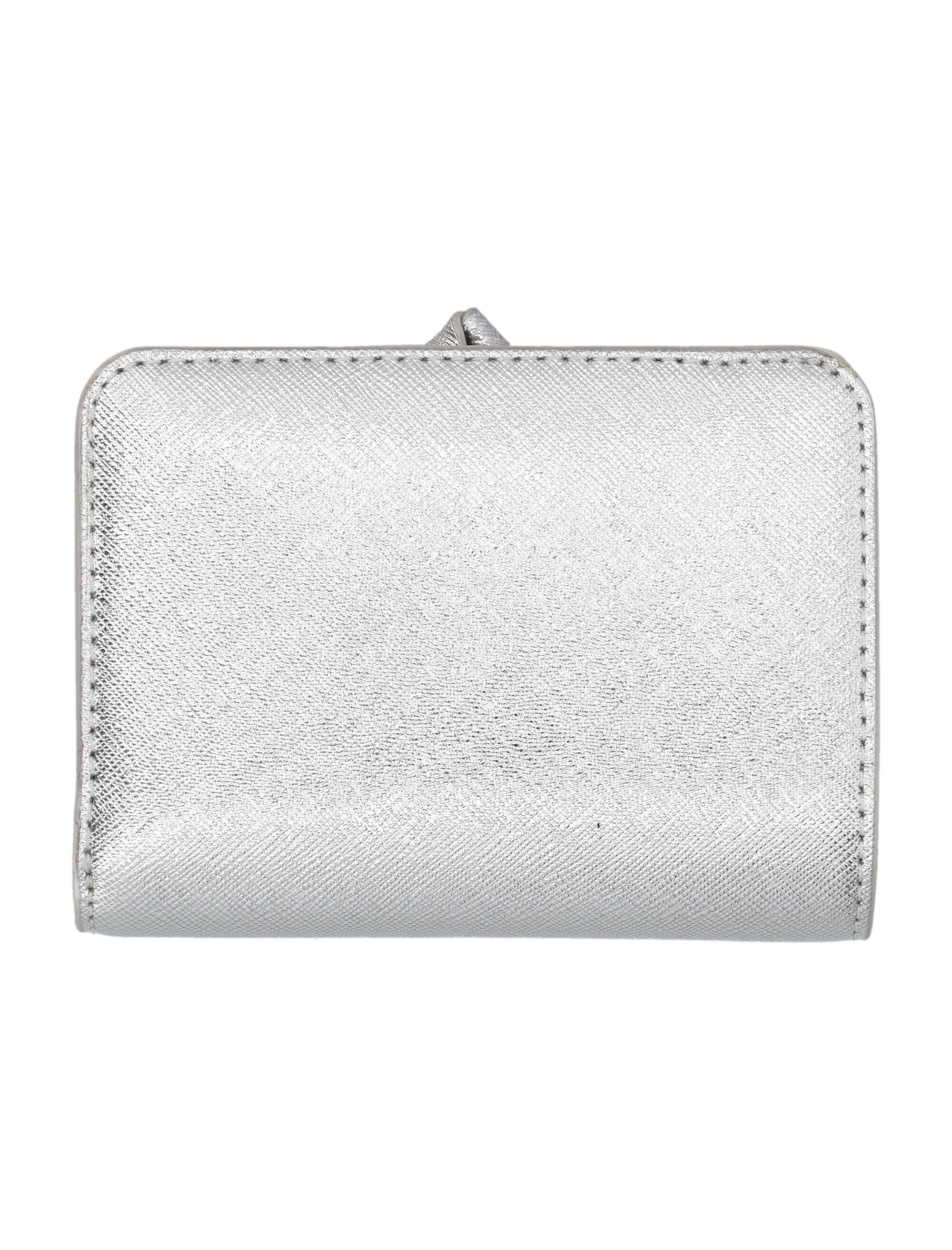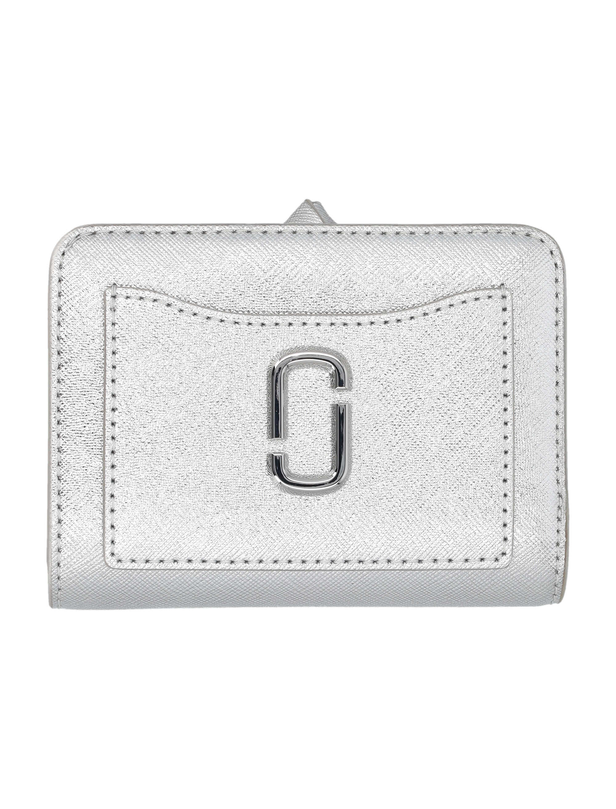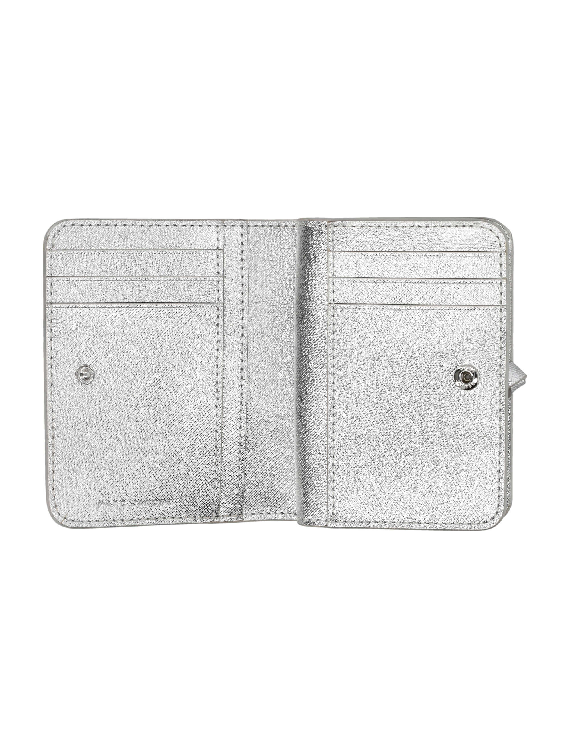 Introducing the stylish and functional SILVER mini compact wallet by MARC JACOBS. Made from high-quality cow split leather, this wallet features a compact bi-fold design with six card slots, a bill compartment, and a snap closure. Stay organized in style with this must-have accessory!