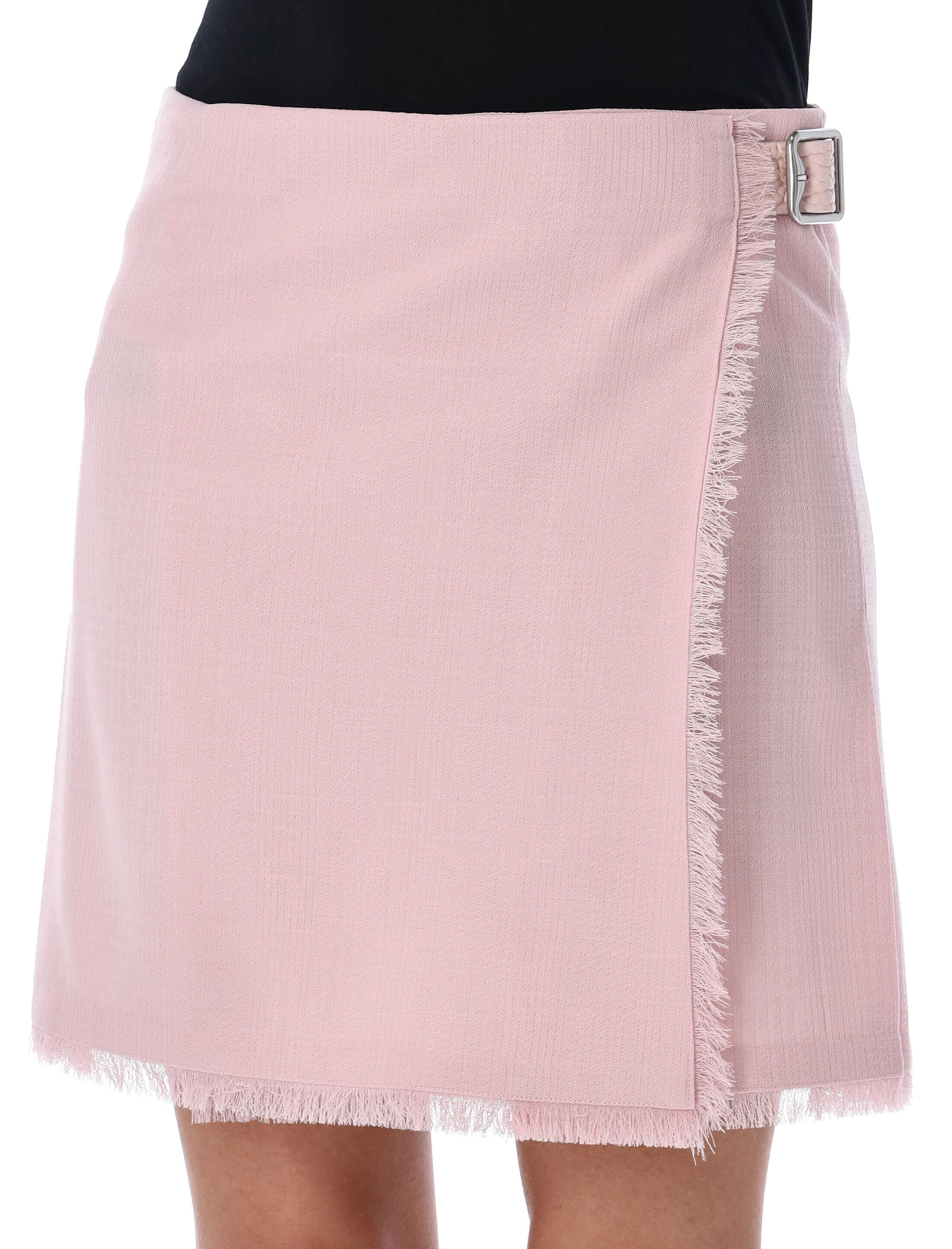 Elevate your style with this stunning Wool kilt by Burberry London. Crafted from 100% virgin wool in a timeless CAMEO color, it features a textured Prince of Wales check, a regular waist, pleated design, and button and buckle strap closure. The fringed edges add a touch of sophistication. Perfect for any occasion, this kilt is a must-have for any fashion-forward woman. Embrace luxury with BURBERRY.