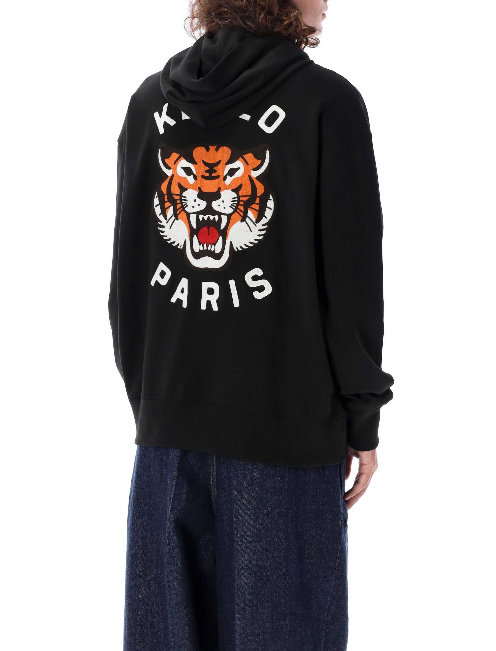 Stay stylish and comfortable in this Black Lucky Tiger over hoodie from Kenzo. Made from 100% cotton, it features a relaxed fit, soft fabric, hooded collar, kangaroo pocket, and iconic 'K' and tiger logo embroidery. Perfect for everyday wear. Model is 1.90m and wears size L.