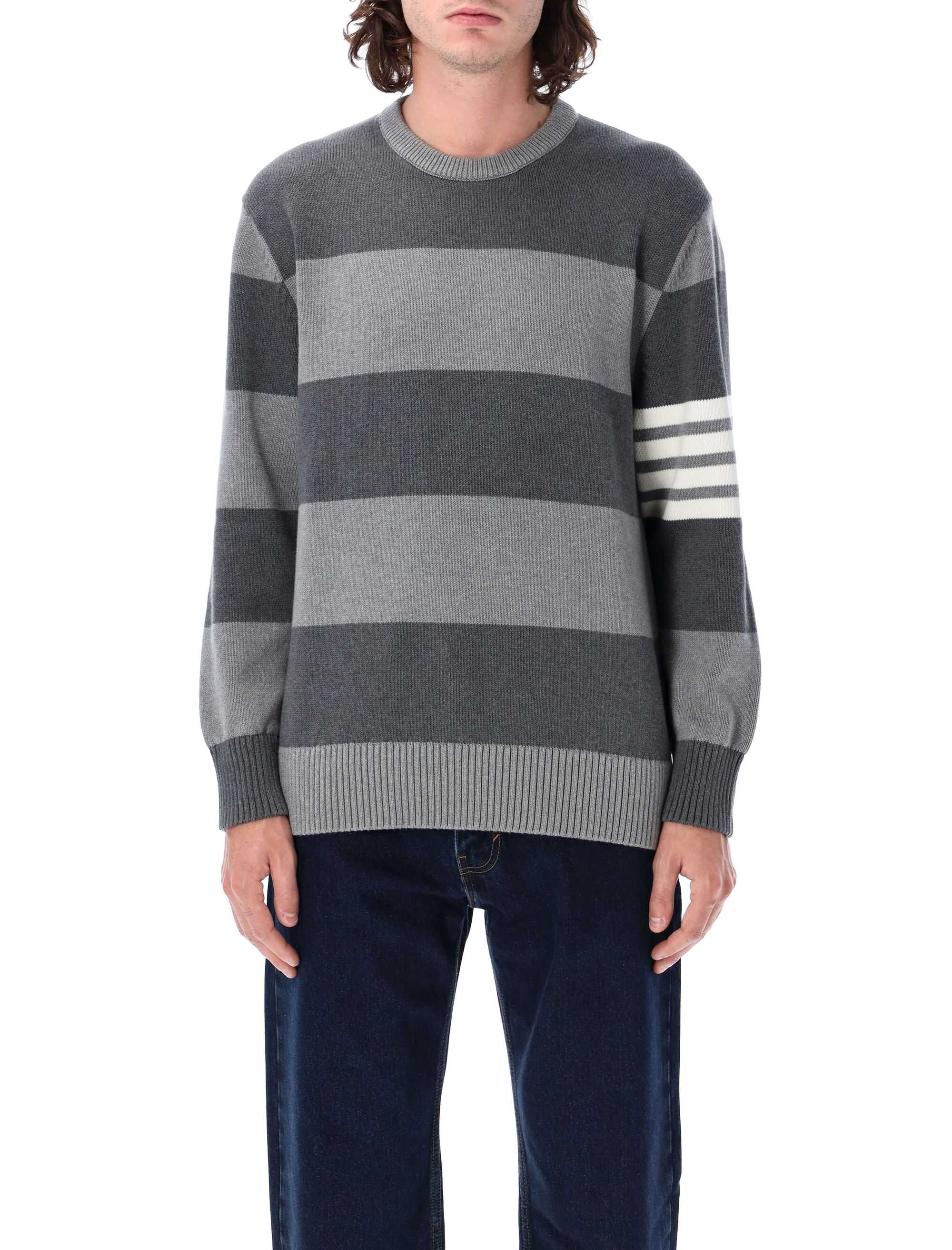 Elevate your wardrobe with the Rugby Rose Icon Sweater from Thom Browne. Crafted from 100% cotton, it features a stylish wide stripe pattern, 4-bar detailing, and a unique high-low hem. Perfect for making a statement in comfort.