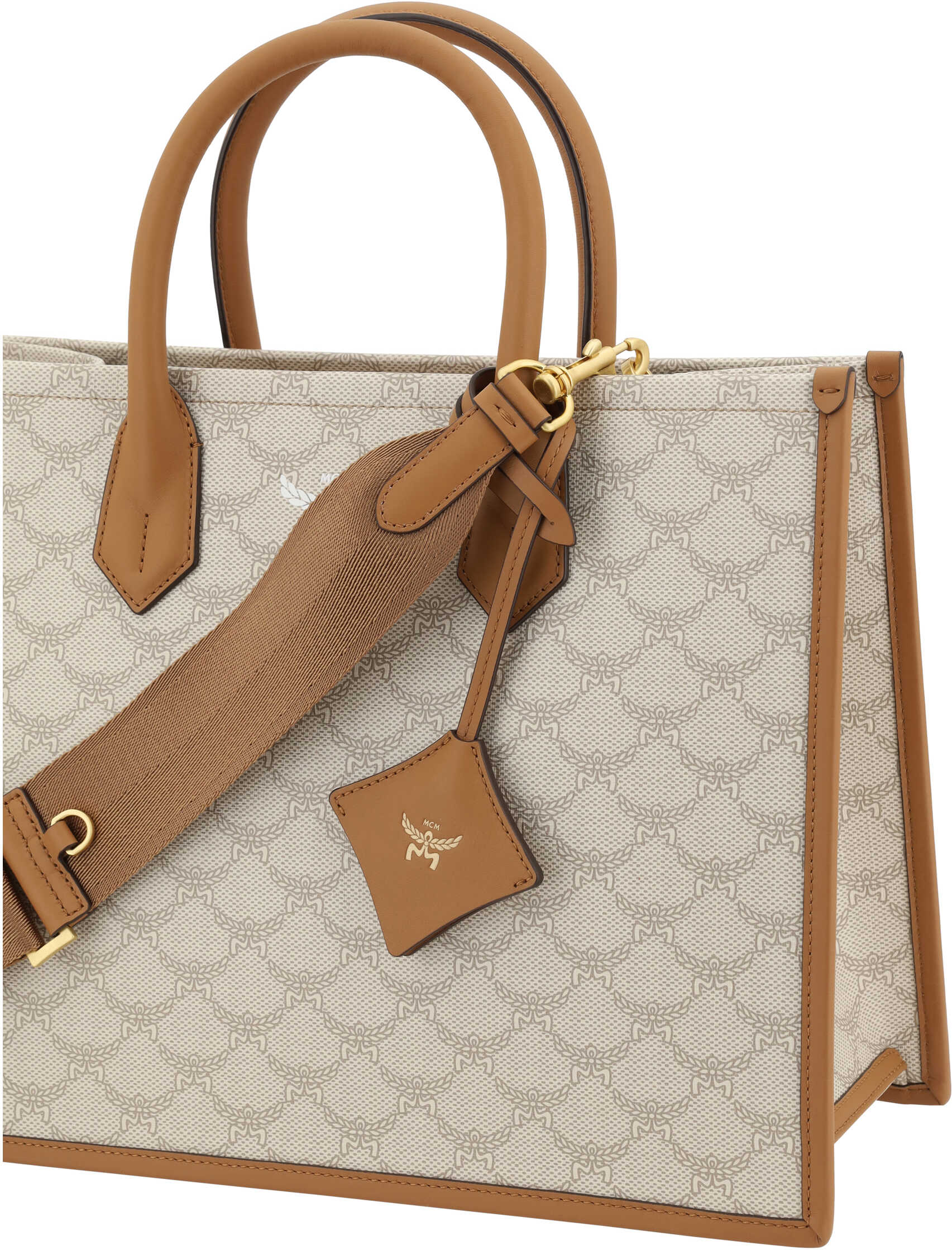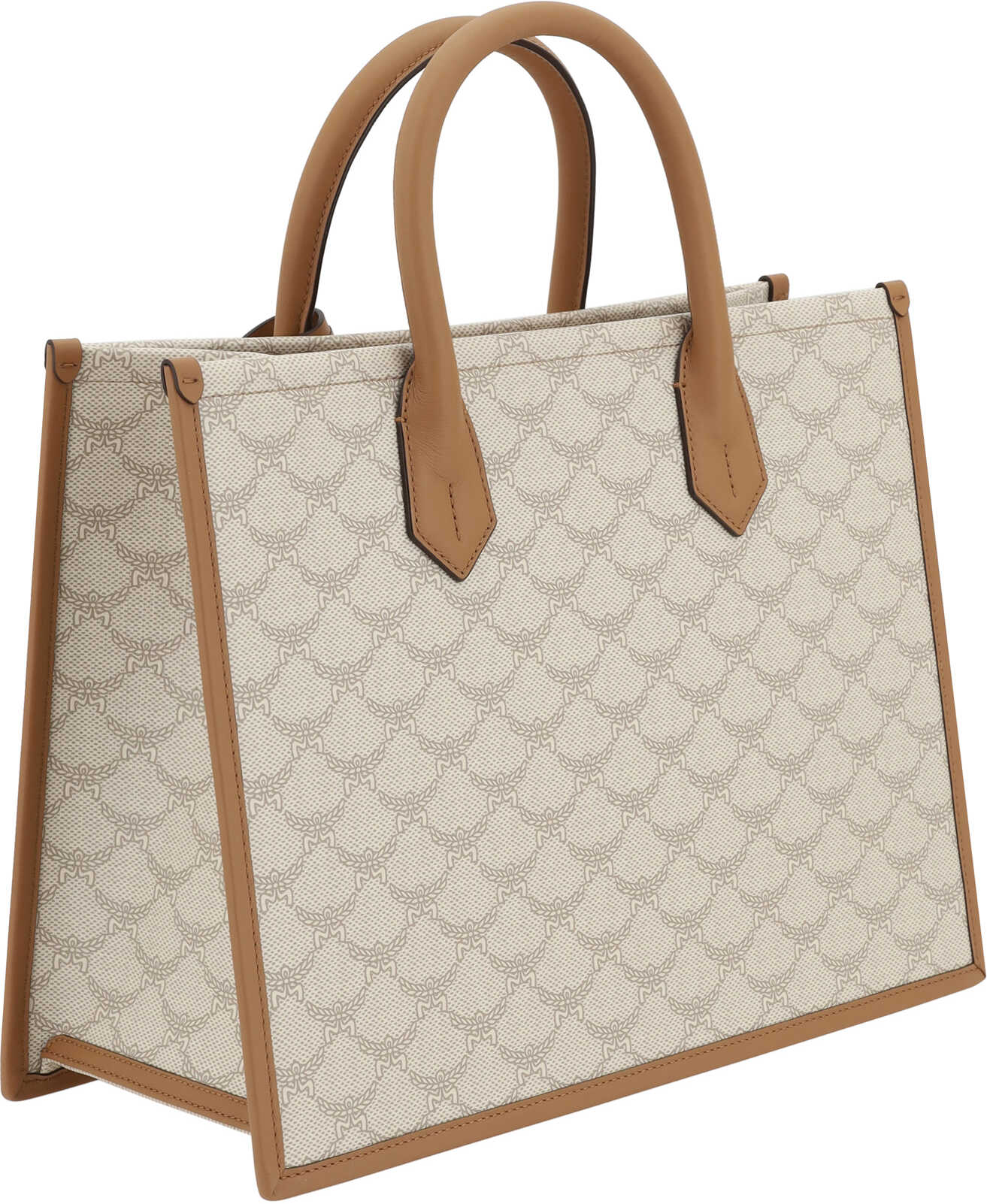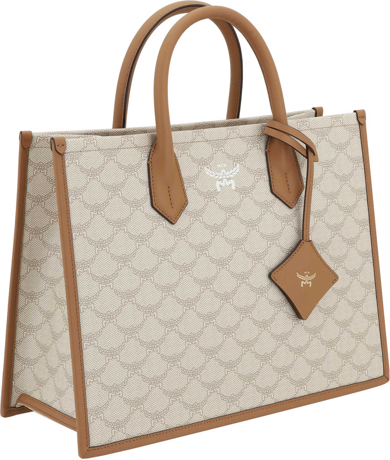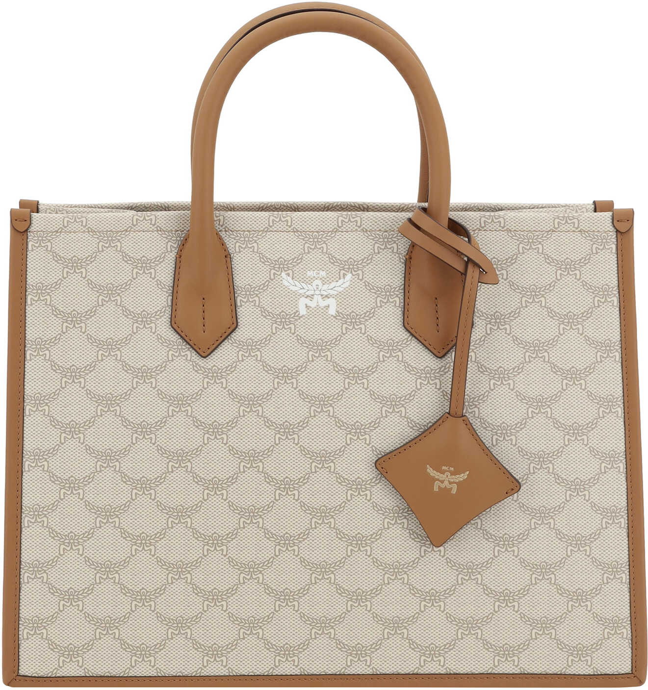 Handbag by MCM, two tubular top handles, single interior compartment, iconic all-over contrasting brand logo, brand monogram on front, adjustable and removable flat shoulder strap, geometric design.