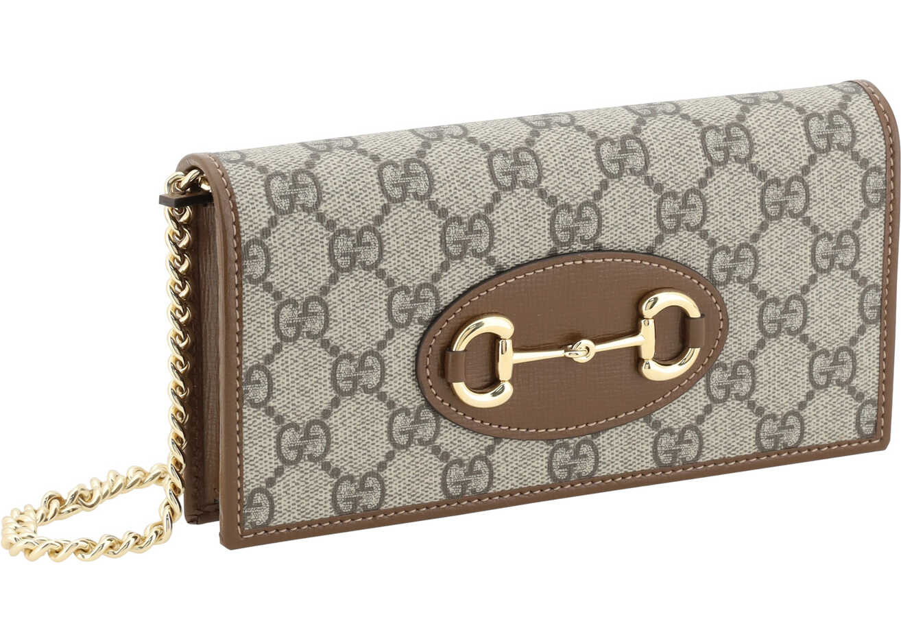 Ebony Wallet Chain Wallet by Gucci, GG Supreme texture, horse-bit on front, snap button closure, removable chain shoulder strap, internal zip coin purse and card slots.