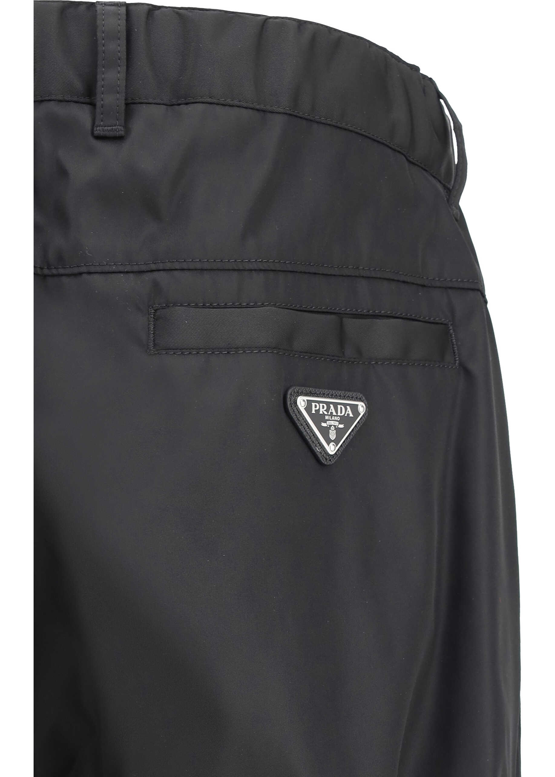 Pants by Prada, hook-and-eye front zipper closure, two side slash pockets, two welt pockets at back, belt loops waistband, elasticized waistband, iconic triangular enameled brand signature plaque applied at back, regular fit.