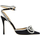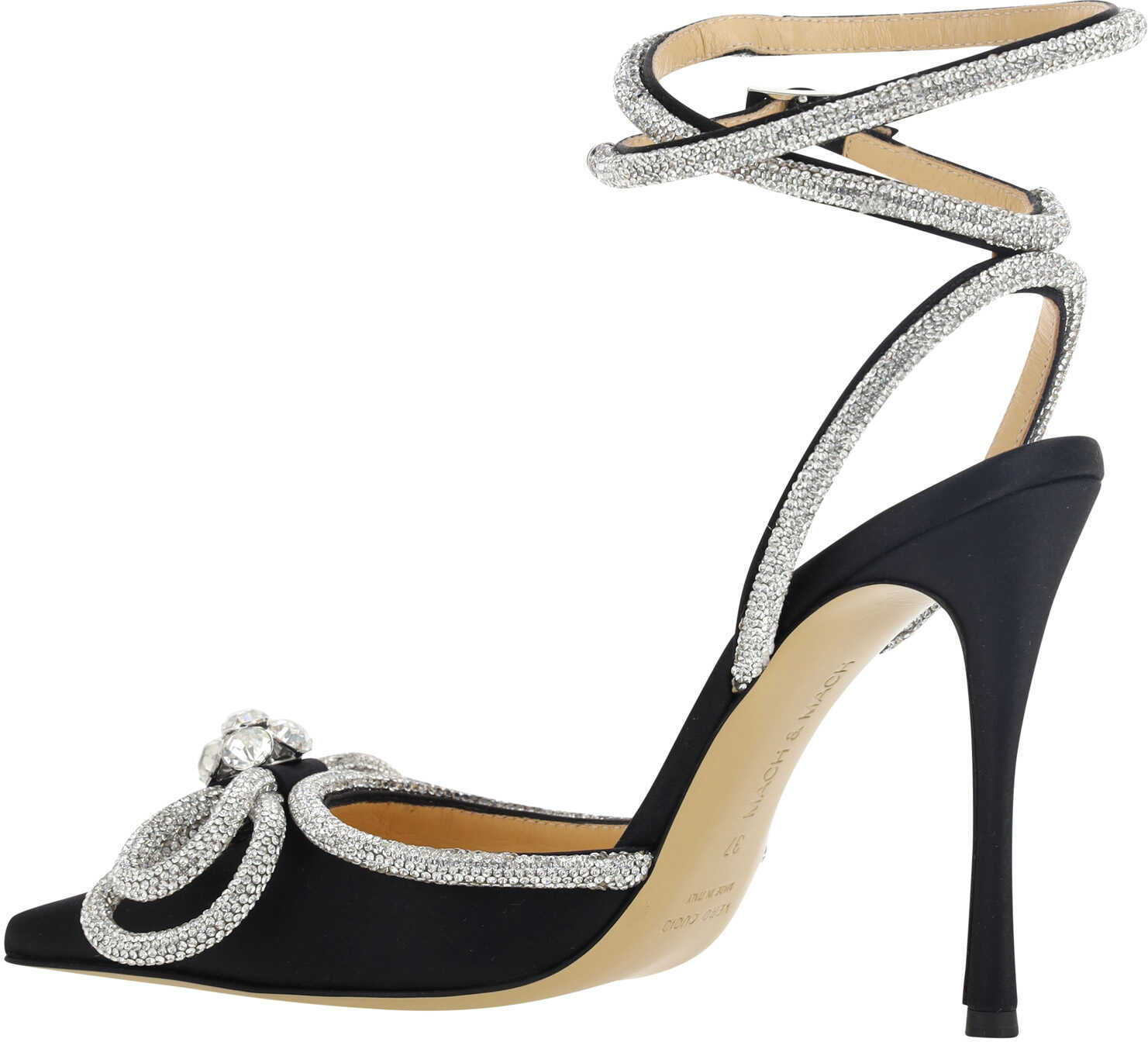 Calfskin Sandals by Mach & Mach, geometric toe, adjustable strap closure by side buckle on ankle lap, satin finish, leather stiletto heel, shiny bow with beaded appliqué jewels on front, beading made of micro crystals, logo-embossed insole.