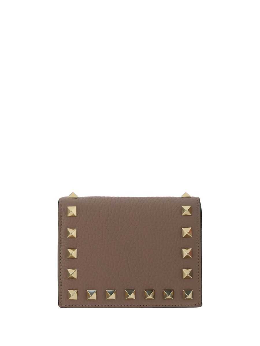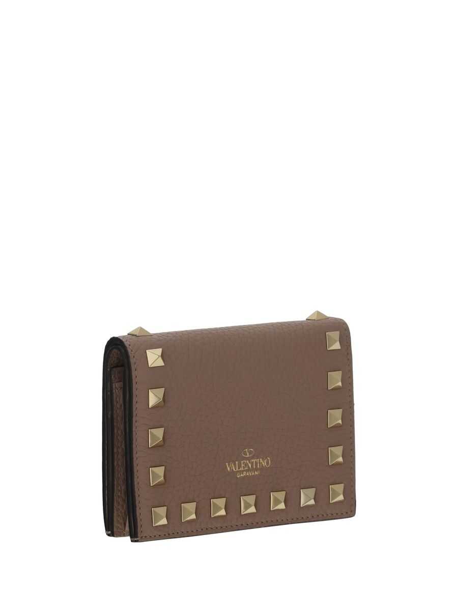 Valentino Garavani's flap wallet crafted in powder pink grained leather adorned with signature platinum-tone metal studs. Fabric / leather-lined interior with zip coin pocket, bill compartment, slip pocket and five card slots. The design is completed by the unmistakable embossed logo at back.