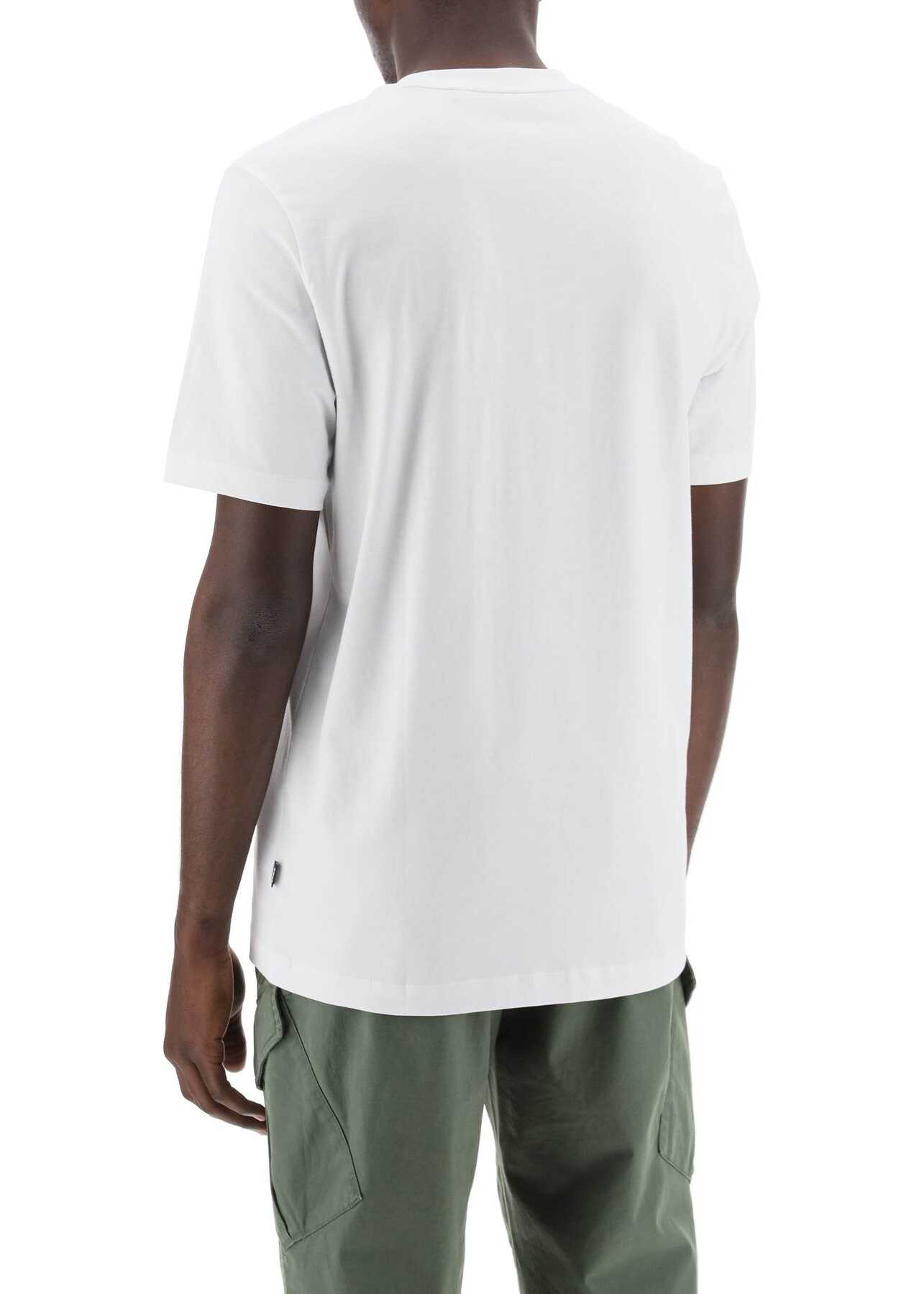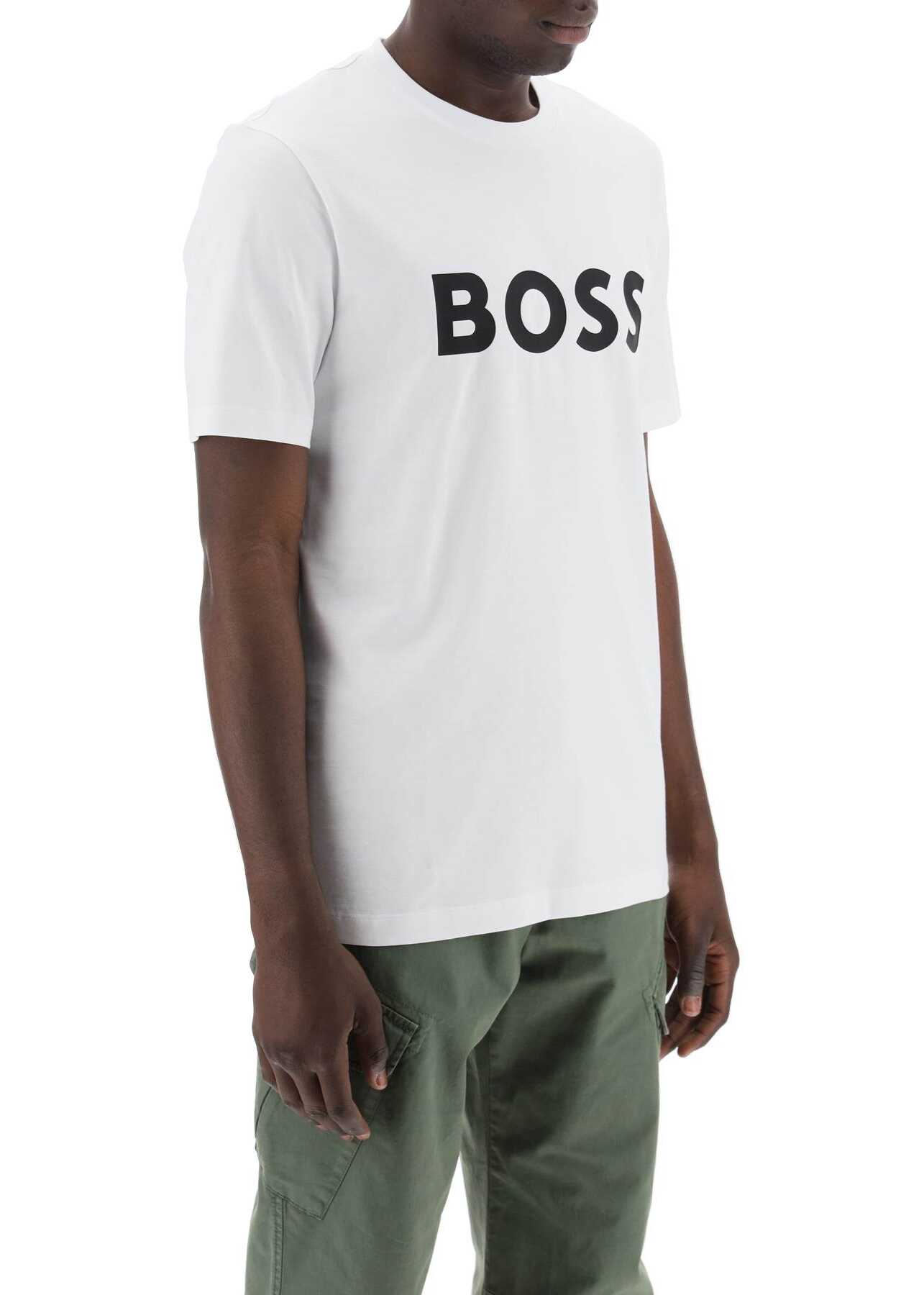 A short-sleeved T-shirt in cotton jersey with Boss logo printed across the chest, finished with a ribbed crew neck. Regular fit. The model is 187 cm tall and wears a size L.