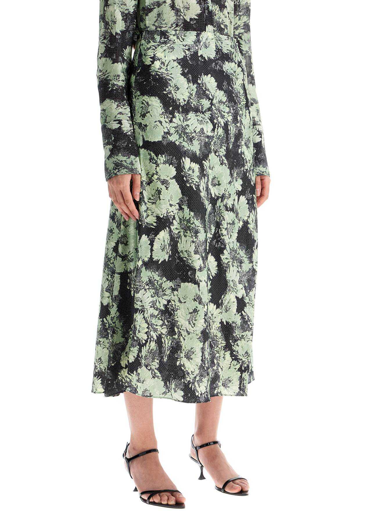 This midi skirt by Tory Burch is made of floral print satin. It features a fitted silhouette on the hips, with a high waist and flared bottom. The side closure has an invisible zipper. The model is 177 cm tall and wears a US size 2.