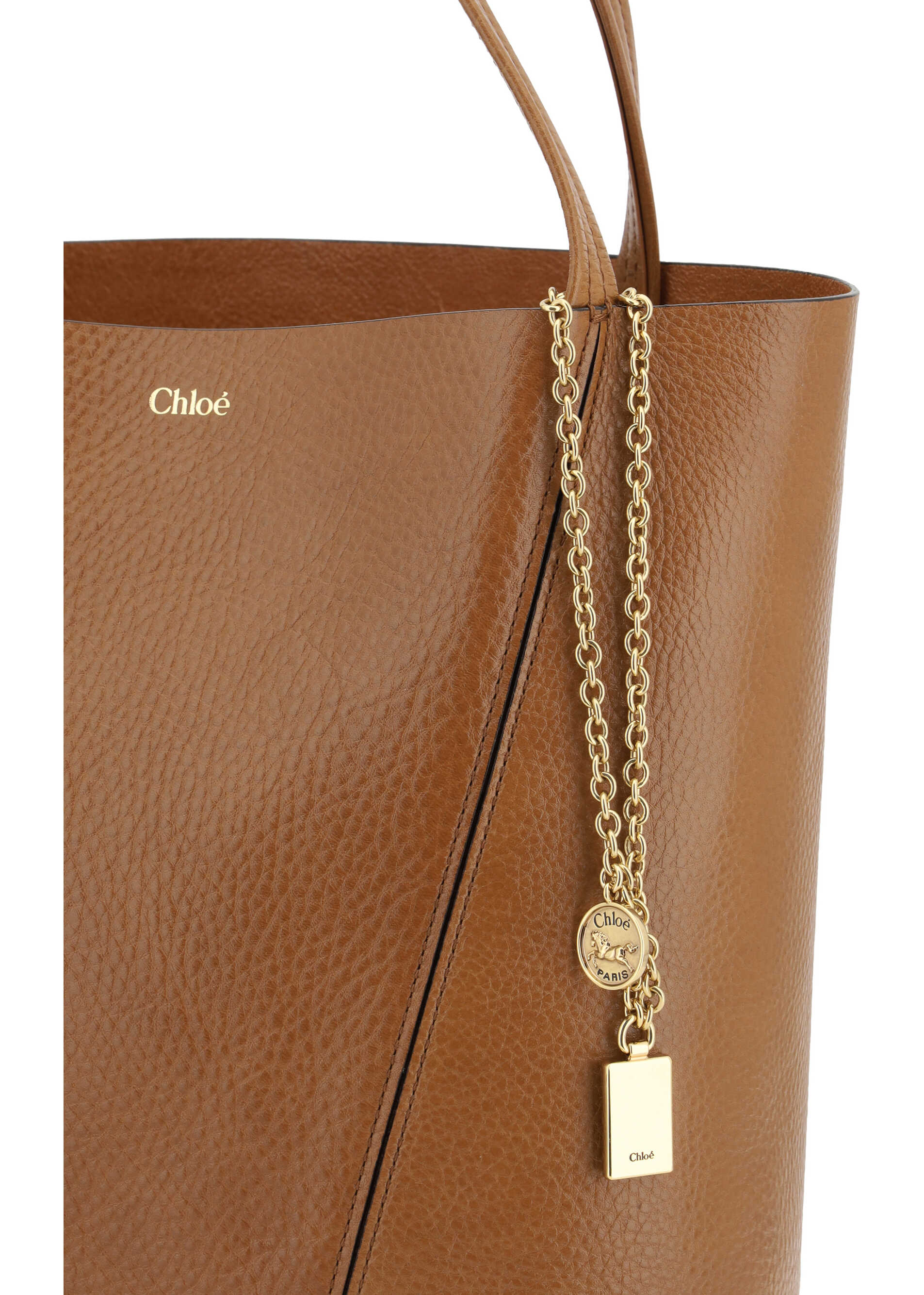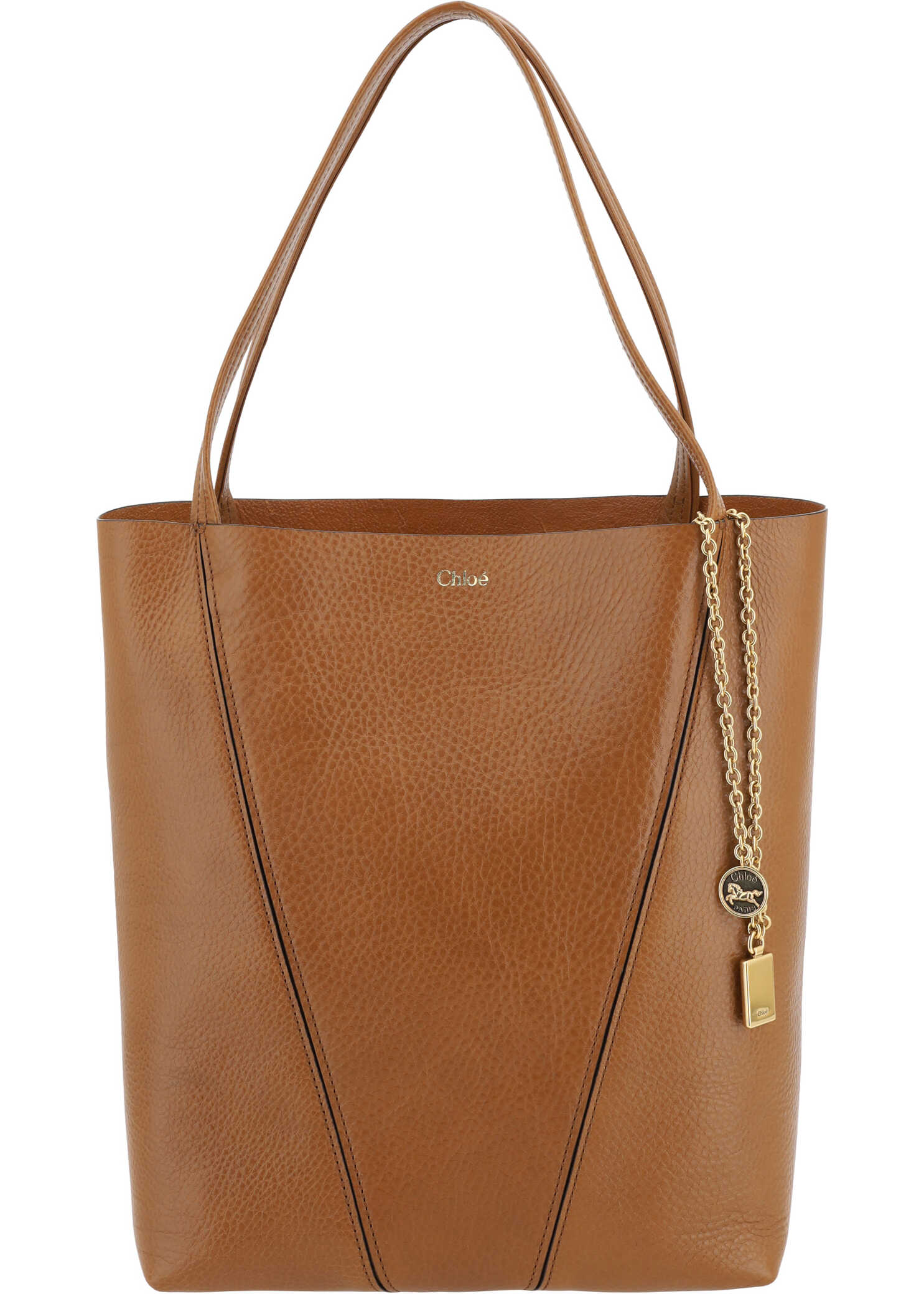 Leather Spin Shoulder Bag by Chloé is a refined and modern accessory featuring a sleek grained leather design. The two flat top handles offer a comfortable and practical grip, while the brand's iconic monogram, press-stamped on the front, adds a distinctive touch of luxury. The closure of the bag is made via a ring that holds the two handles together, an element that gives it a unique and functional look. A fascinating detail is the chain with a pendant bearing the iconic logo applied to the handle. The interior of the bag consists of a single compartment.