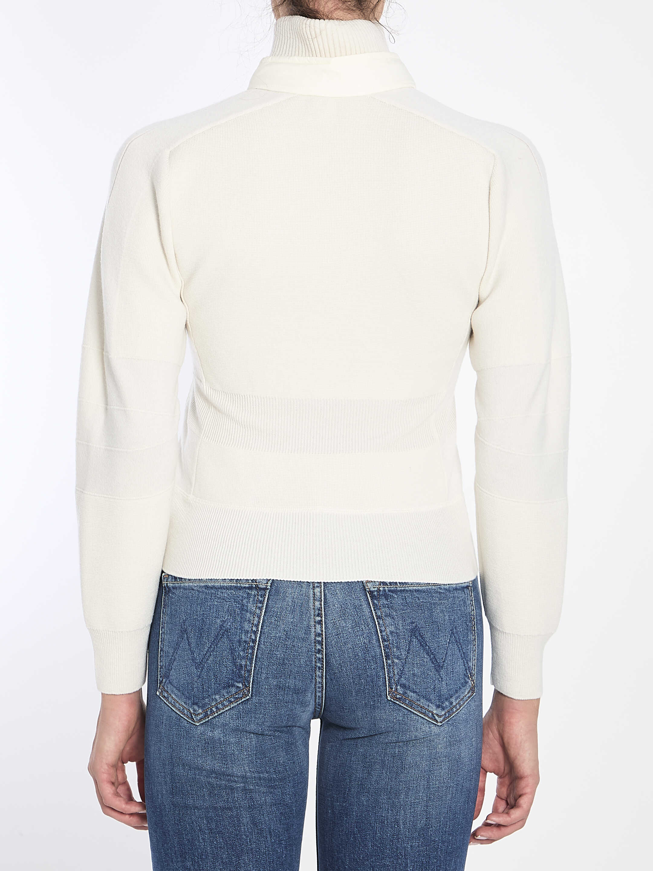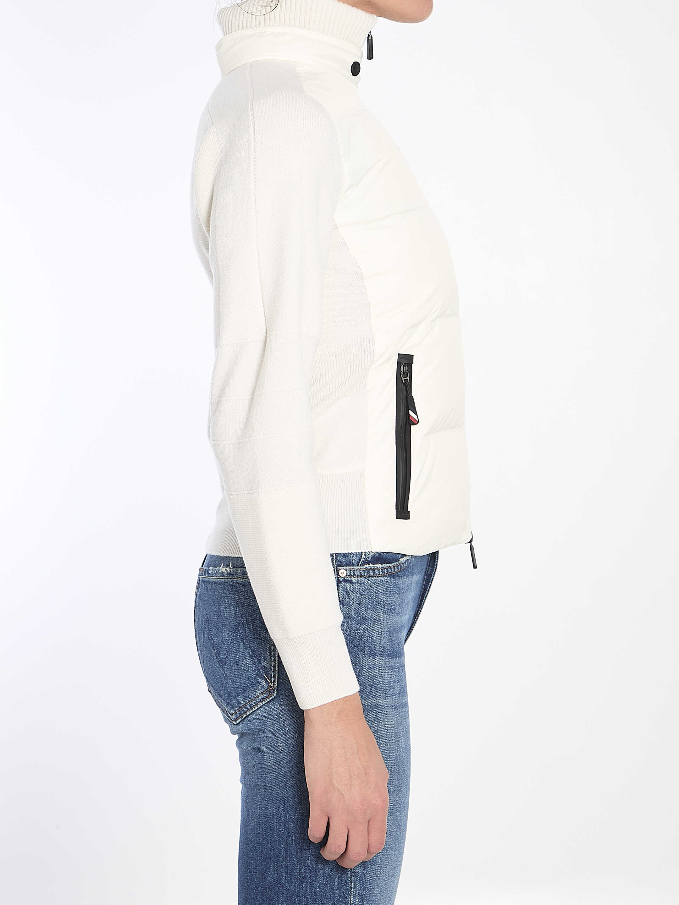 Moncler Grenoble white cardigan with down padding and drawstring hood. It features hest logo, stand-up collar with snap button, raiwear lining, zip closure, two front zip pockets, wool side panels and underarm sections, nylon inserts on the sleeves, and satin stitch embroidery on the back. Regular fit.