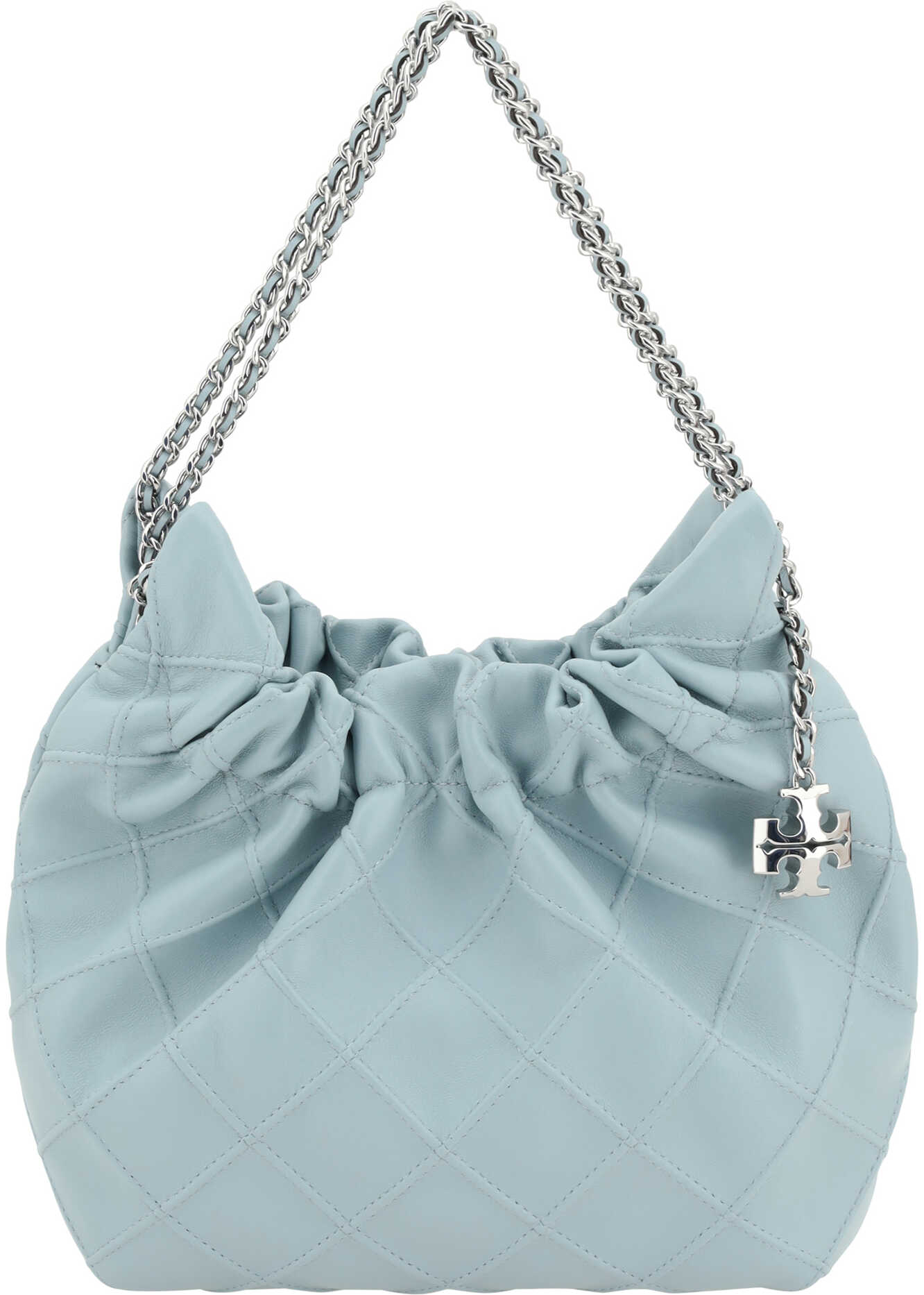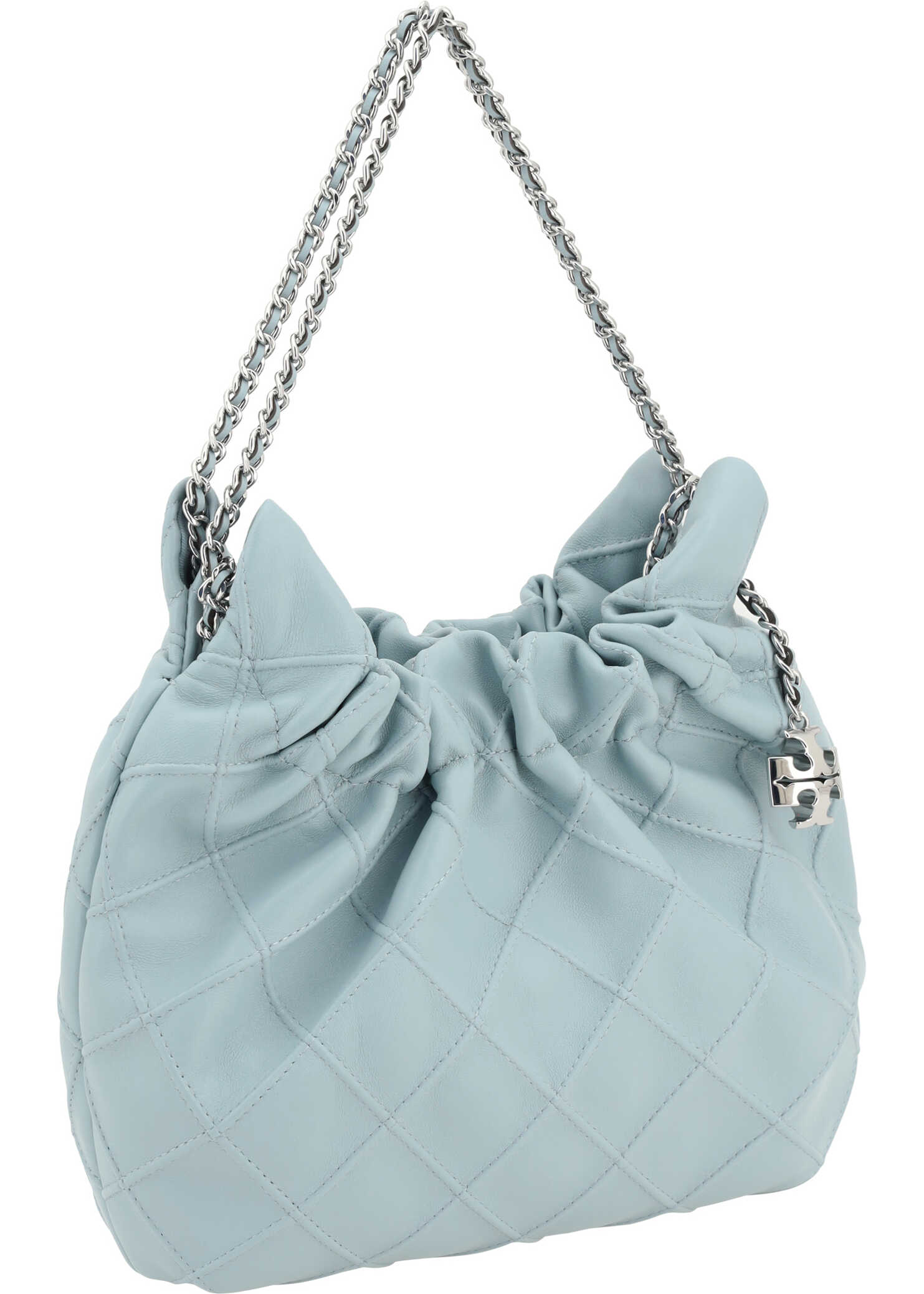 Leather Fleming Mini Hobo Shoulder Bag by Tory Burch, magnetic button top closure, two chain handles with contrasting leather inserts, chain shoulder strap with contrasting leather inserts, single interior compartment, all-over plaid design.