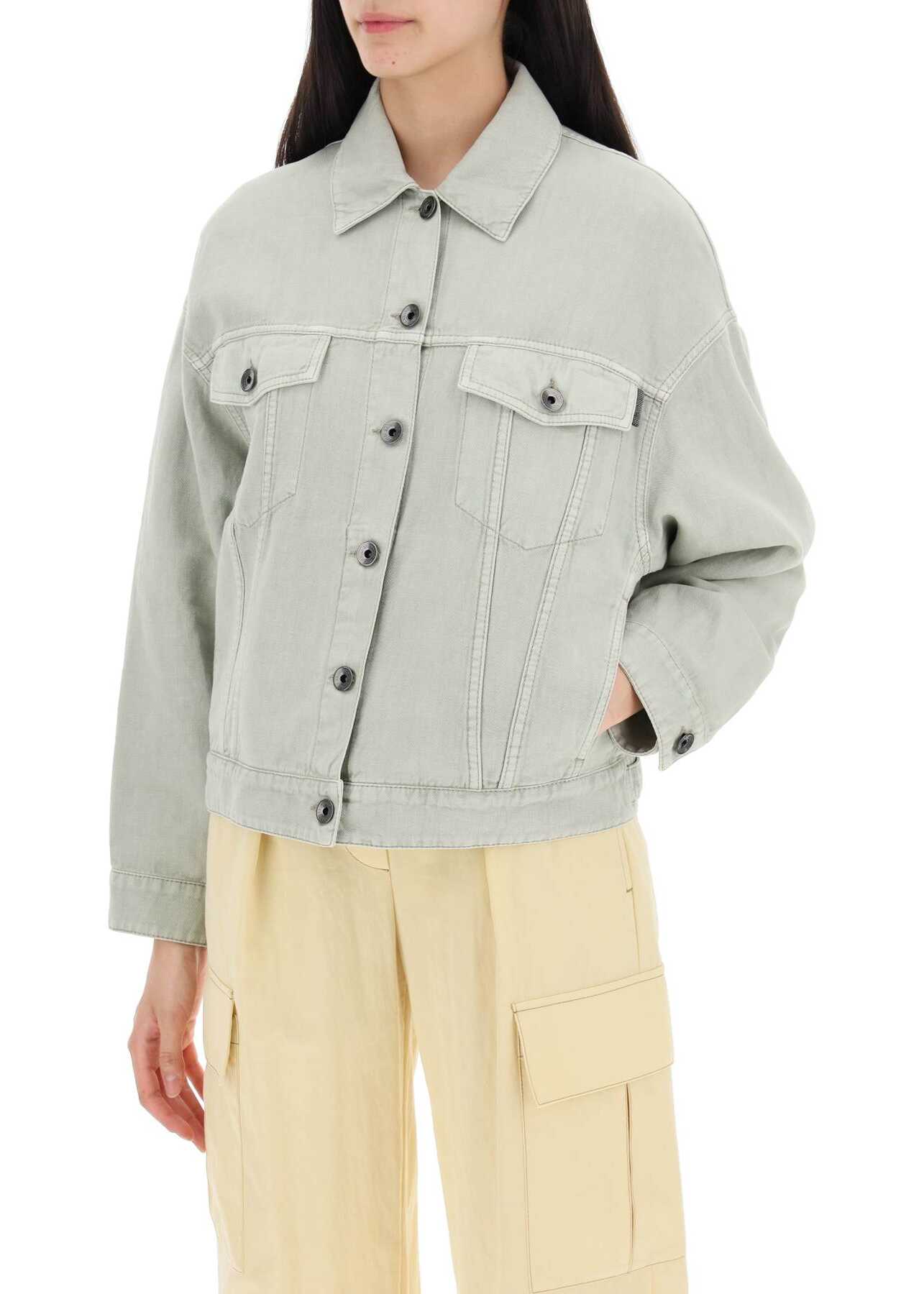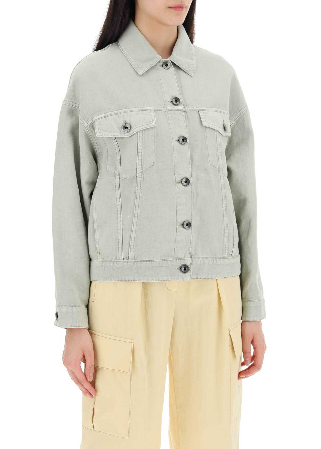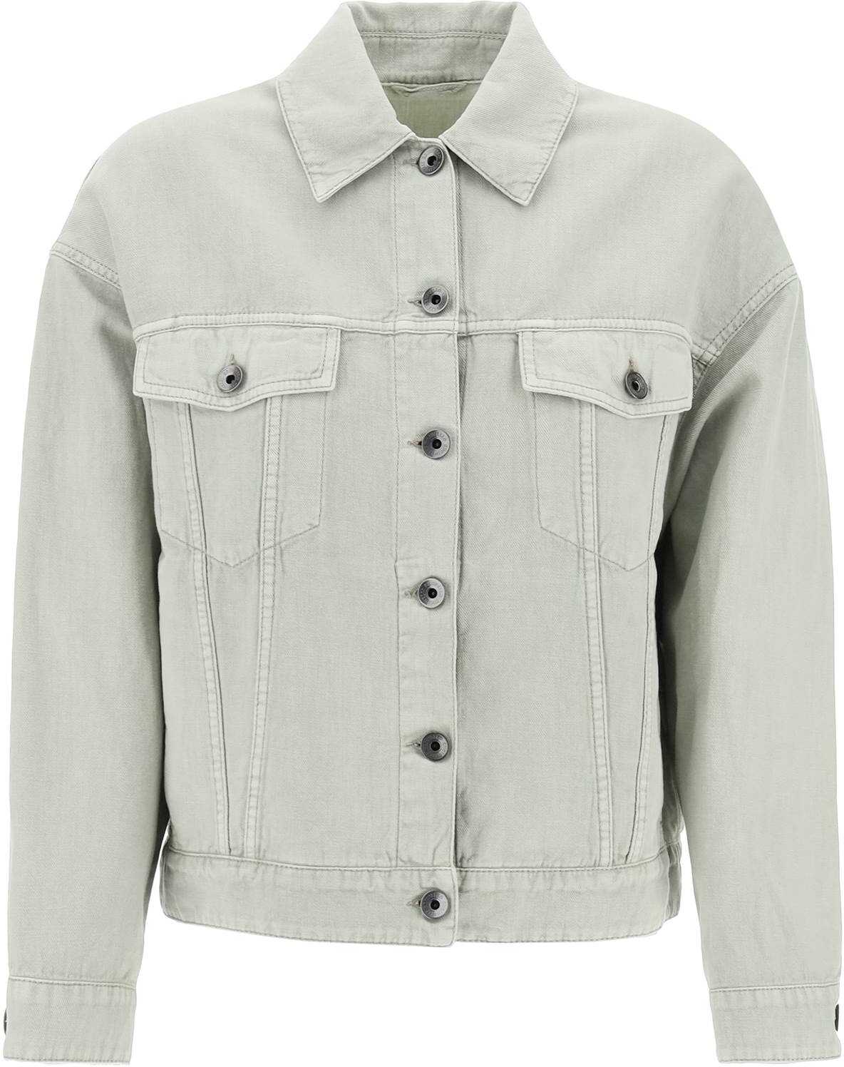 The Brunello Cucinelli Trucker Jacket is made of Cover, a soft and compact fabric blend of cotton and linen. The slightly boxy cut is enhanced by dropped shoulders for a relaxed fit. It features a classic collar, front button closure, and chest pockets with branded buttons. In-seam pockets and button tabs on the back hem add functional details. Finished with a Shiny Monile Tab on the front. The model is 177 cm tall and wears an IT size 38