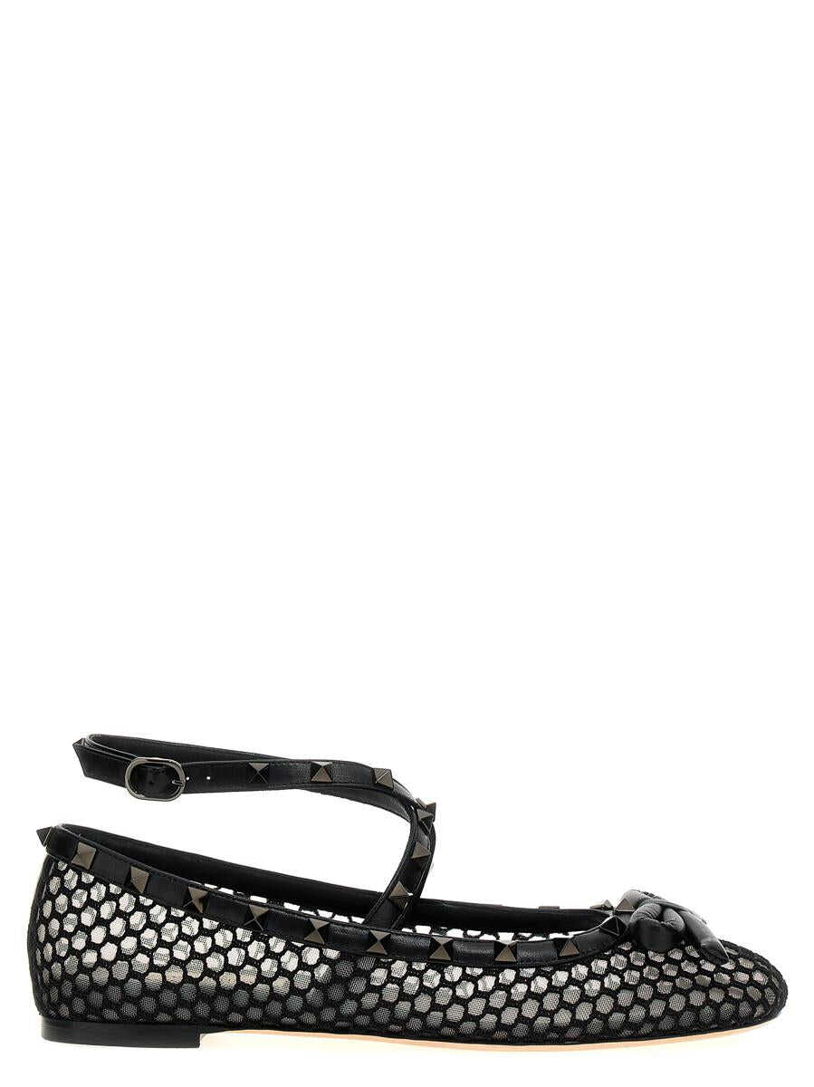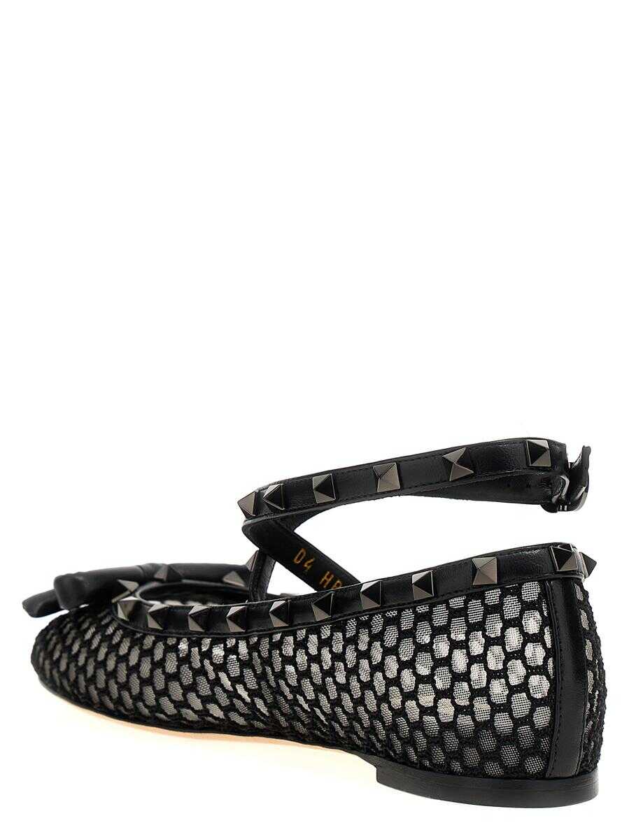 'Rockstud' ballet flats in mesh and crochet fabric with leather details, stud and bow appliqué, ankle strap