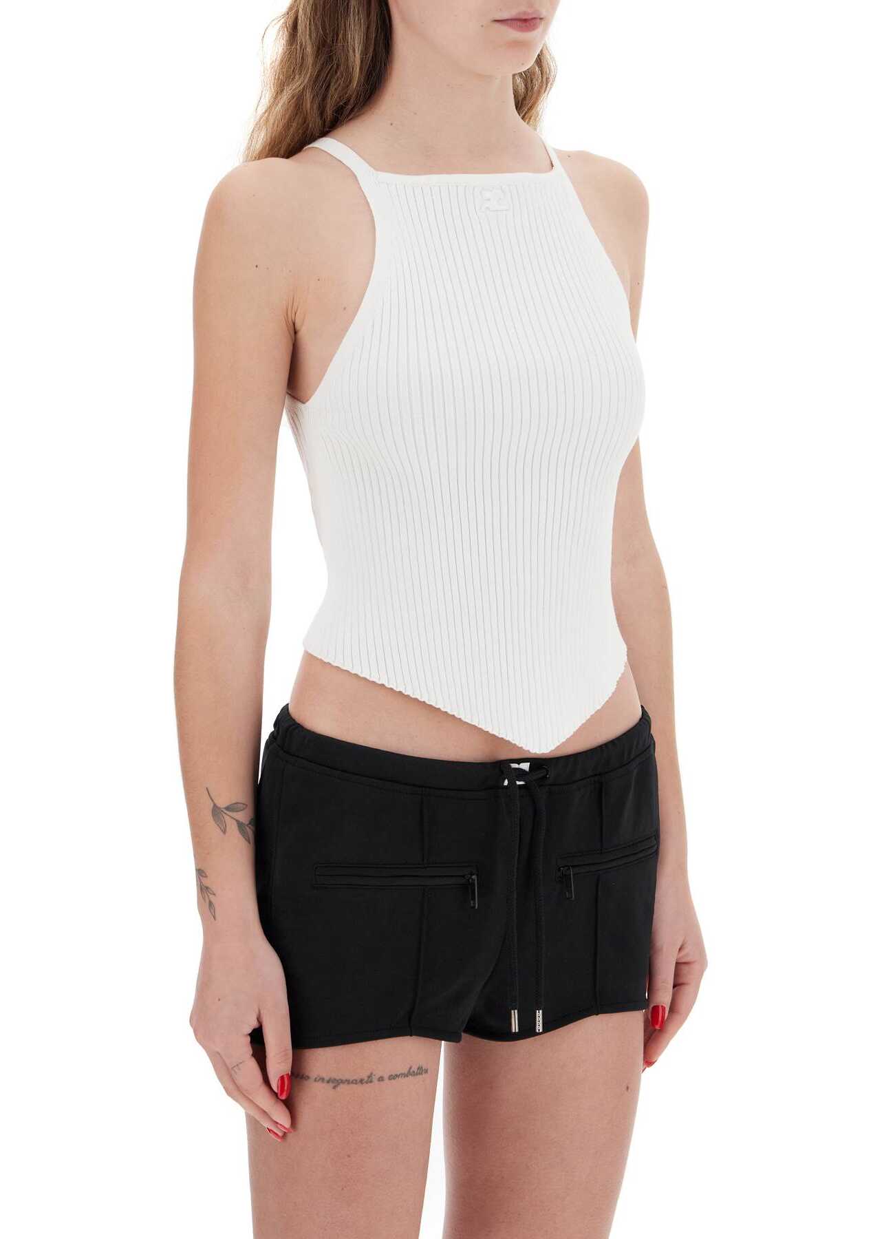 The Courreges tank top is made of stretch viscose knit with ribbed detailing and features an asymmetrical hemline with a pointed front. It has a square neckline, tonal logo patch on the front, and a fitted silhouette. The model is 177 cm tall and wears size S.