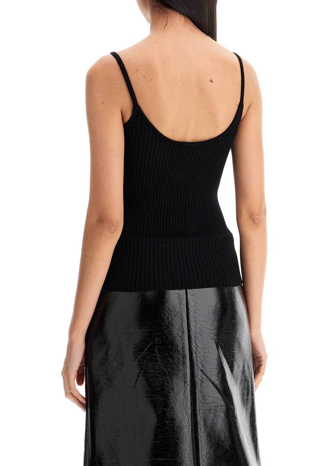 A fitted Courreges tank top made of stretchy rib knit with a contrasting AC logo patch at the front. It features a wide, round neckline on both the front and back. The model is 177 cm tall and wears size XS.