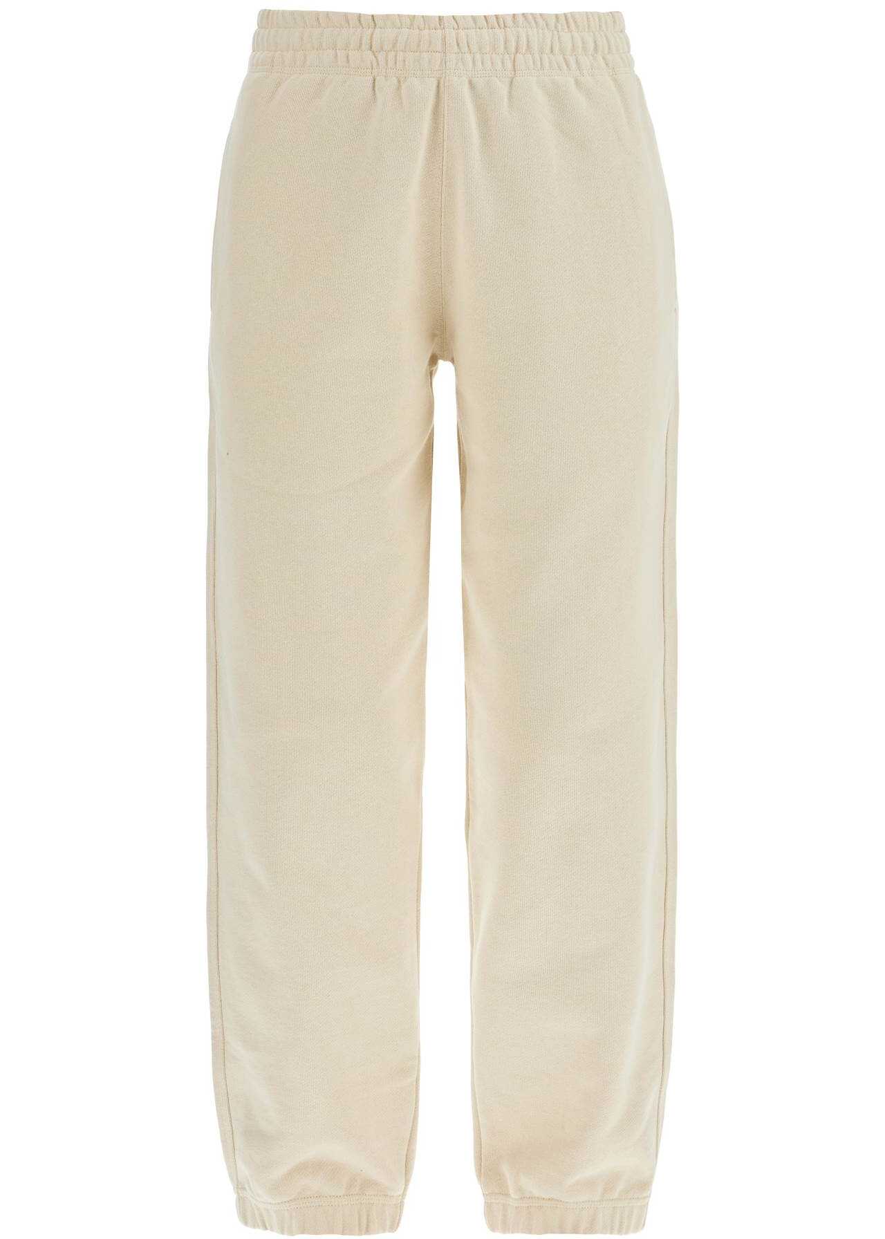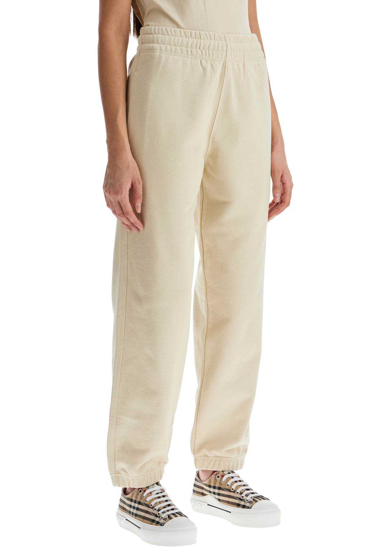 These high-waisted Burberry joggers are made of soft, organic cotton sweatshirt fabric. They feature a relaxed fit with an elasticated waistband and internal drawstring, as well as elasticated cuffs, two side pockets, and a back pocket adorned with a logo patch. The model is 177 cm tall and wears a size S.