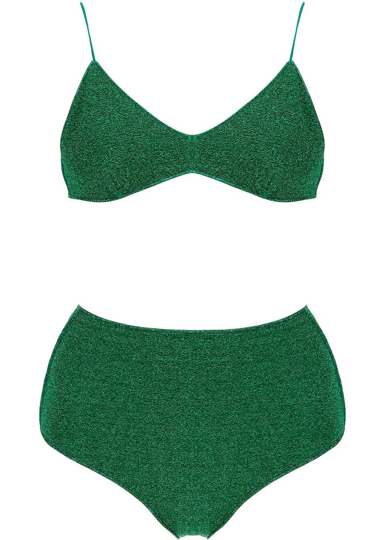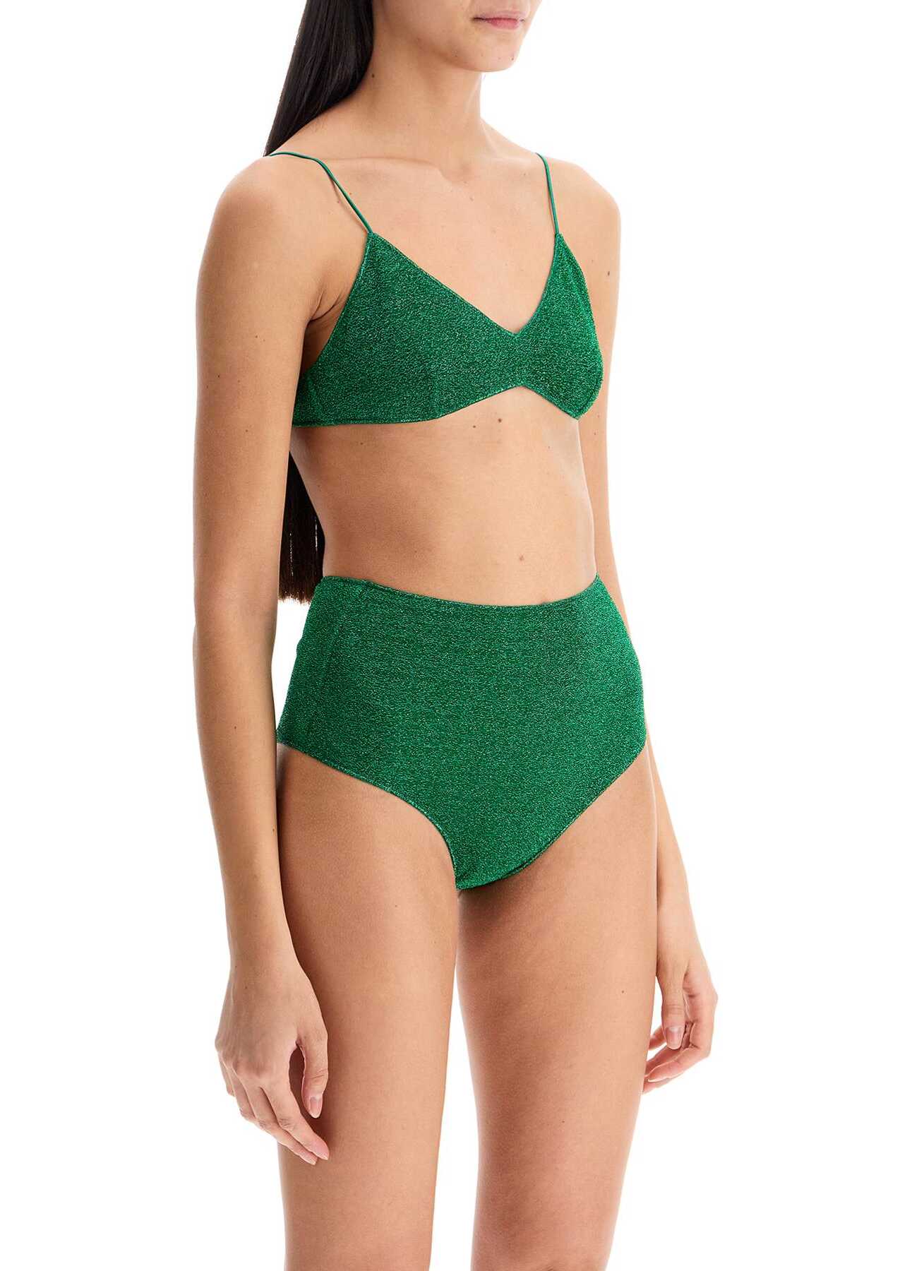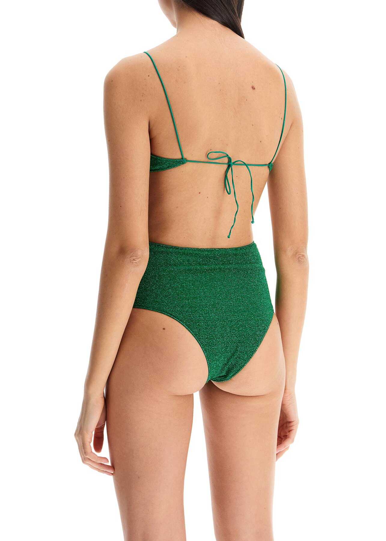 This Osé ree lycra lurex bikini set is composed of a top with thin straps and high-waisted bottoms. The back closure can be adjusted with strings. The model is 177 cm tall and wears size S.
