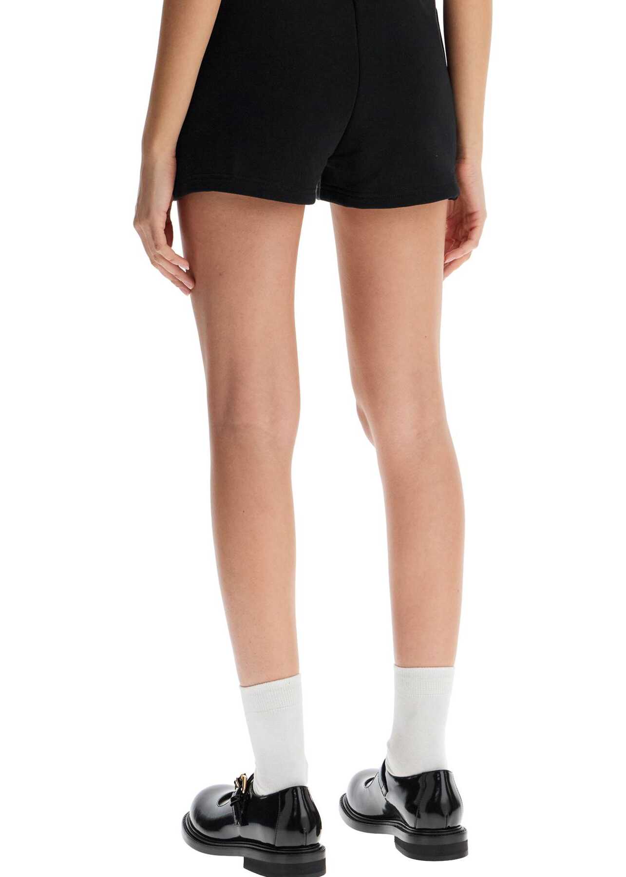 These sporty shorts are made of soft brushed cotton with a printed Moschino Teddy Bear motif on the left side. They feature zippered side pockets and an elastic waistband with an internal drawstring. The model is 177 cm tall and wears size IT 40.