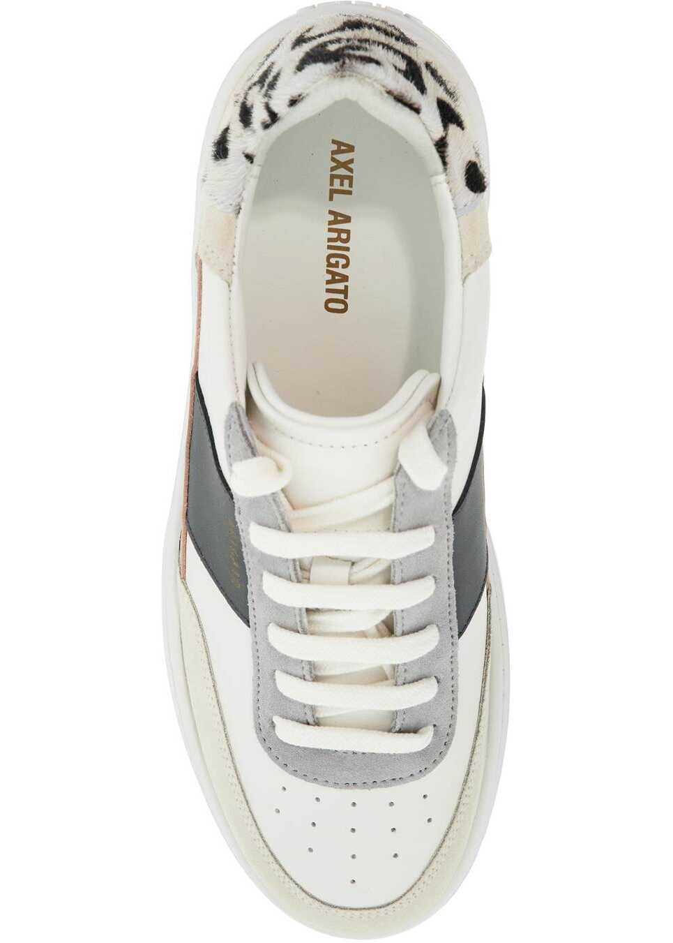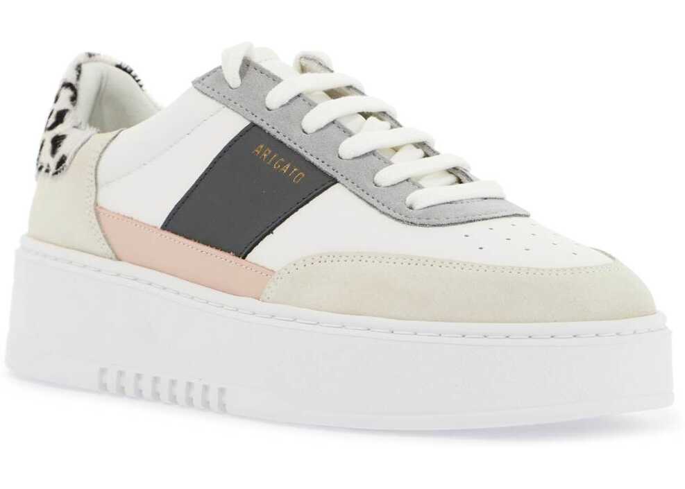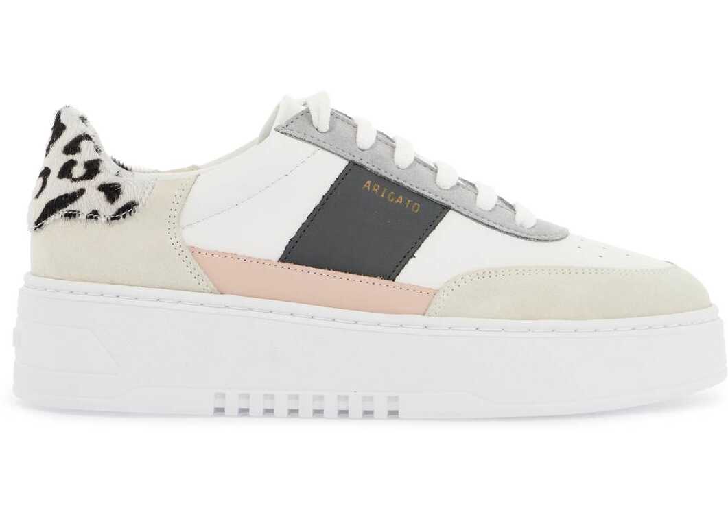The Axel Arigato Orbit Vintage sneakers feature a layered design with smooth leather and suede panels, as well as an animal print pony hair spoiler. The laminated logo lettering is located on the side, while the interior boasts a leather lining and removable insole. These sneakers also have a rubber platform sole for added height and comfort.