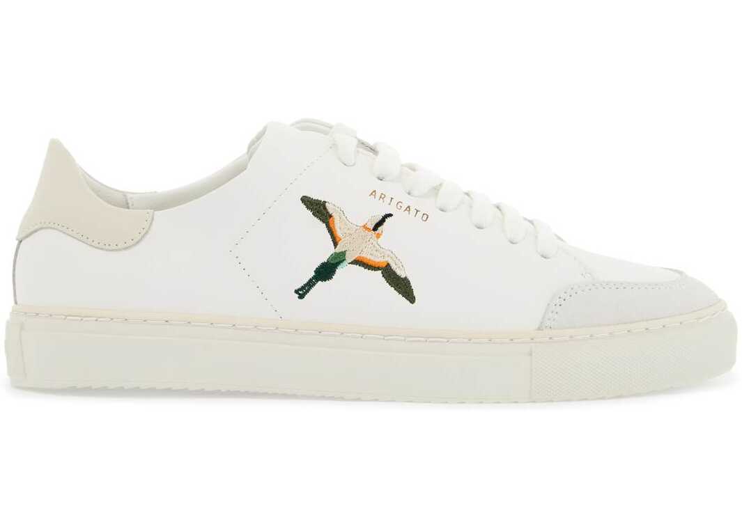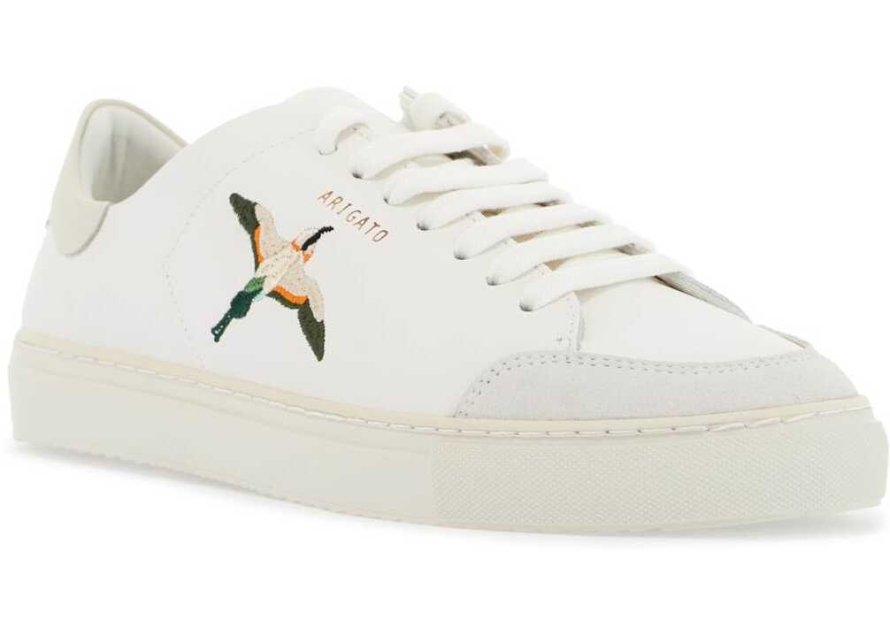 The Axel Arigato Sneakers Clean 90 B Bird are made of smooth leather with suede inserts and adorned with an embroidered hummingbird by Elena on the side. The gold printed logo is located on the side, while the interior features a leather lining with a removable insole and a rubber sole.