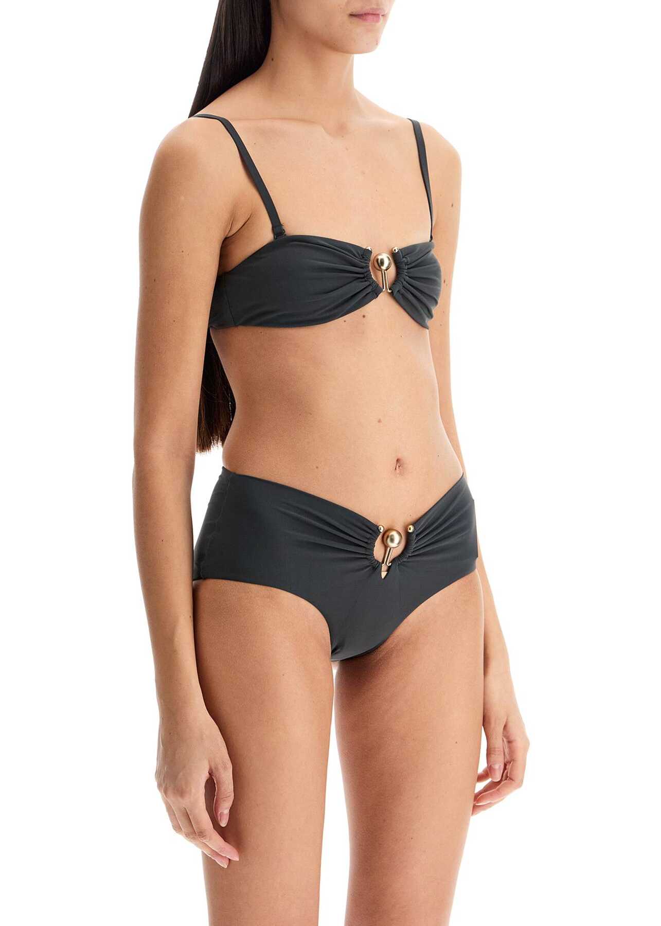 This Christopher Esber bikini top in matte lycra features a draped bandeau design with a central metallic detail. The adjustable and removable straps offer comfort and versatility, while the internal boning on the side seams ensures a flawless fit. No closure. The model is 177 cm tall and wears a UK size 6.