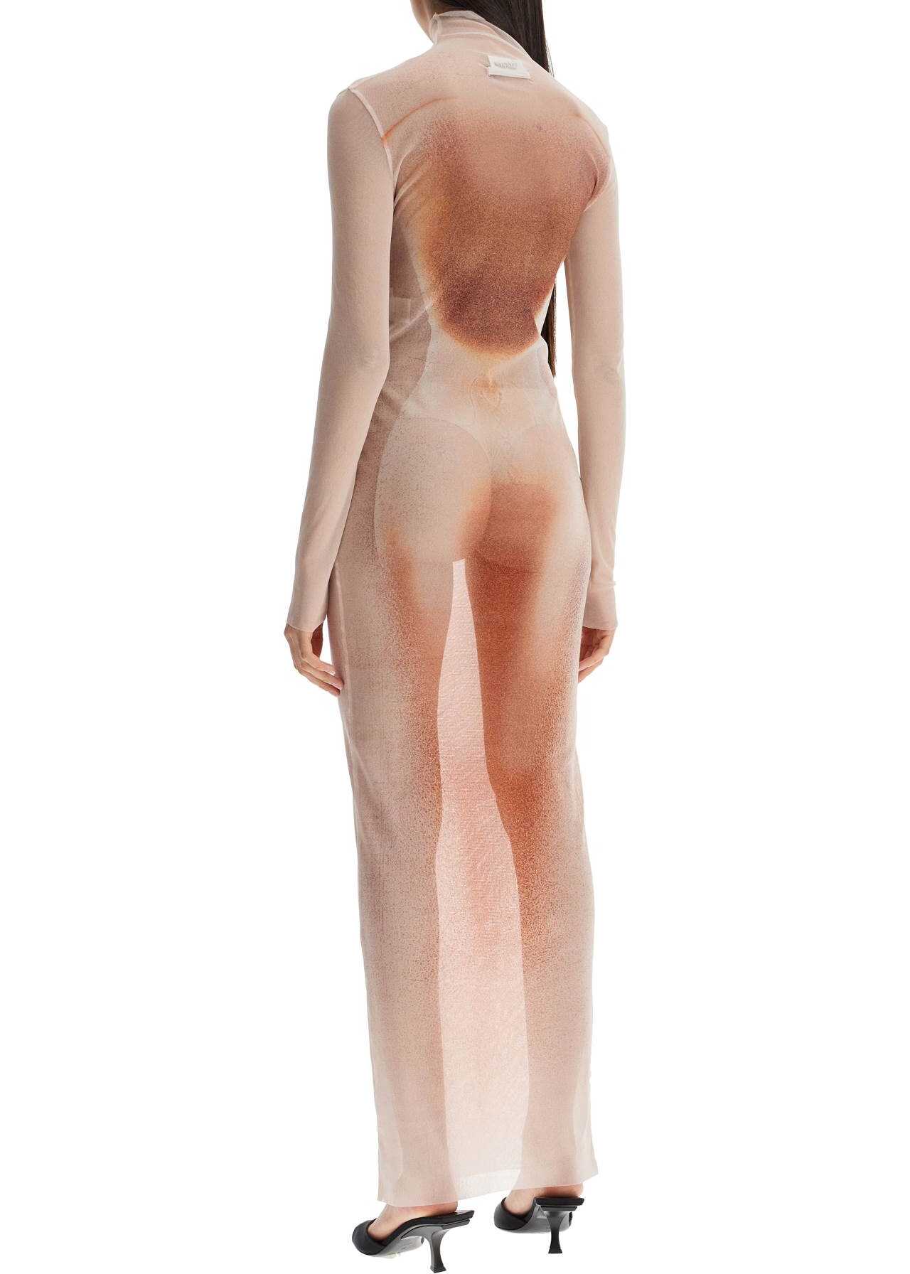 This long dress by Jean Paul Gaultier features an all-over trompe l'oeil 'Le Classique' print. Made of semi-transparent mesh, it has a fitted silhouette with a high neck and long sleeves, finished with raw-cut edges on the cuffs and hem. The model is 177 cm tall and wears size S.