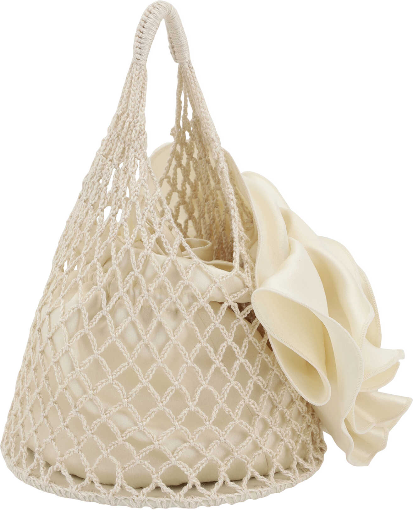 Devana Handbag by Magda Butrym, mesh bucket design, double top handle, interior pouch with closure, iconic maxi flower made of silk applied to the outside.