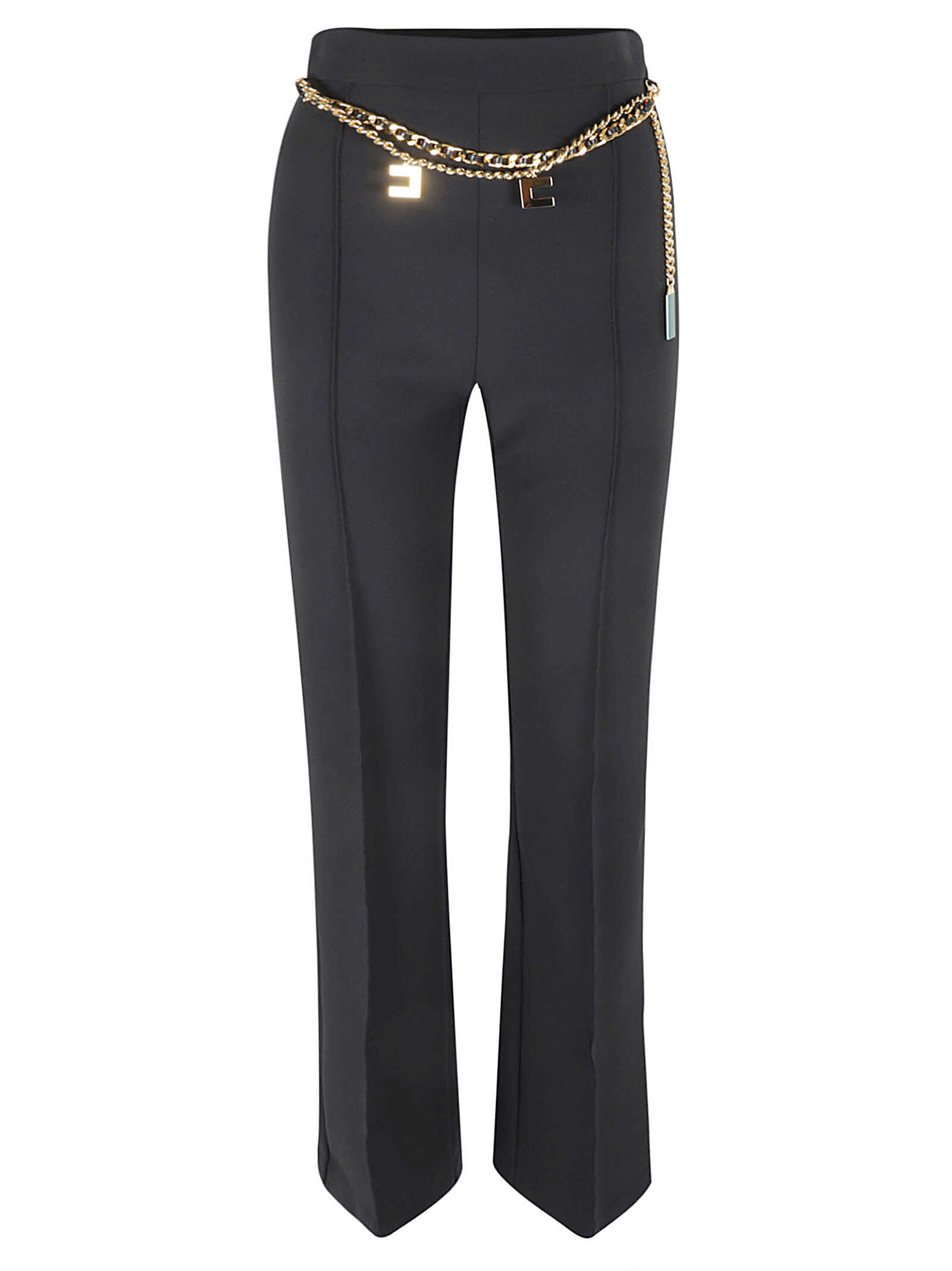 Elevate your wardrobe with the Elisabetta Franchi Black Trousers. Crafted from 100% Polyester, these stylish trousers feature a flared silhouette, a belted waist, and a chic logo charm. Perfect for any occasion, they combine elegance with comfort.